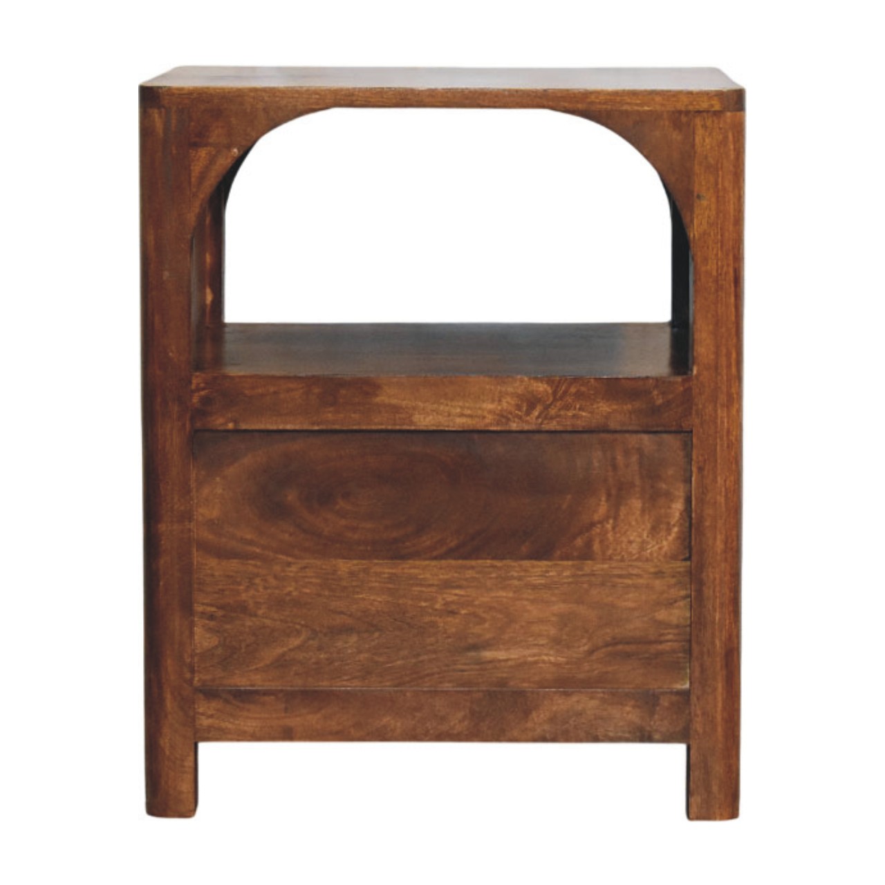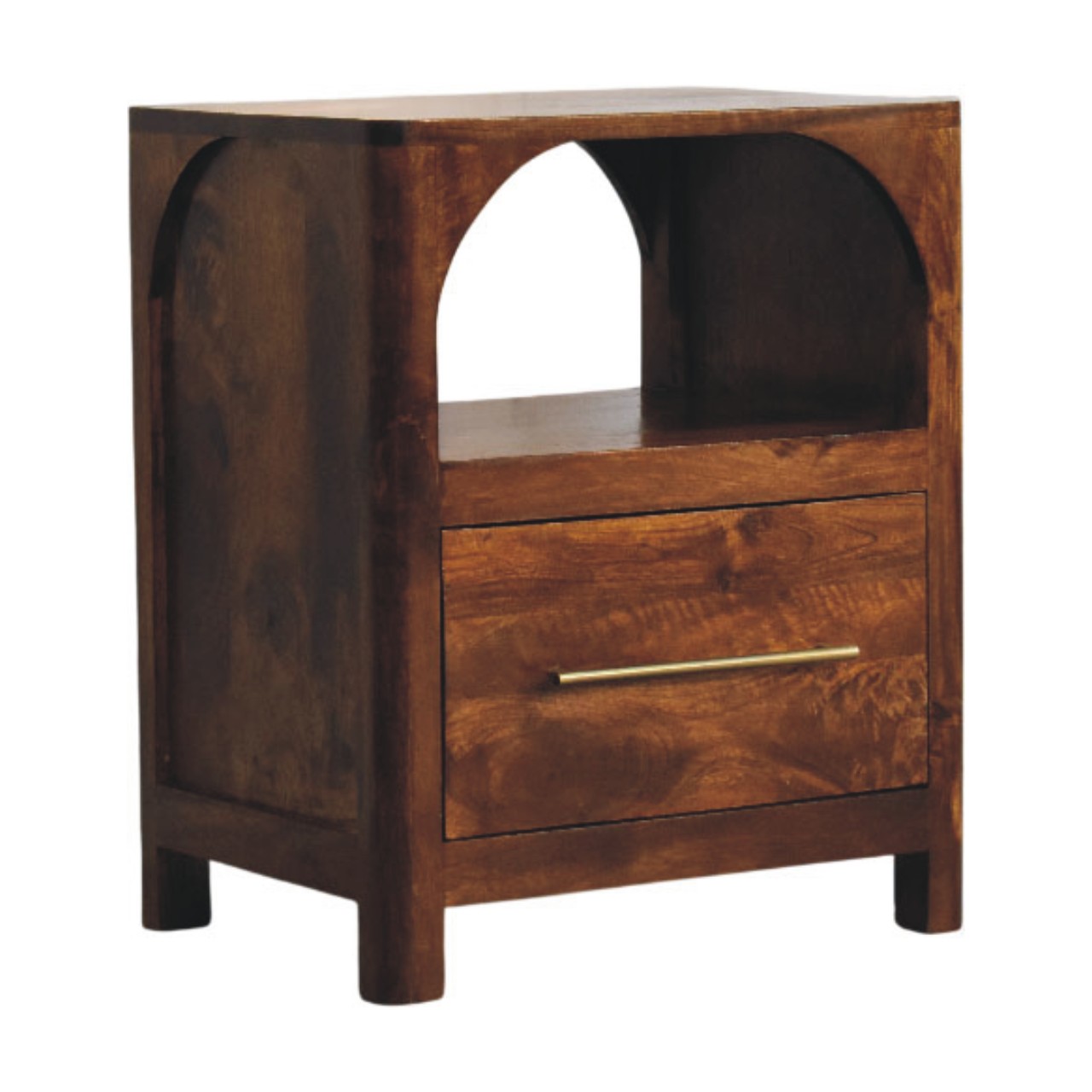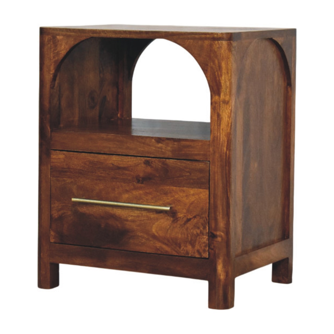 The Arc Bedside Table is a refined storage piece that balances softness and structure through its signature arched open shelf and clean, architectural form. Handcrafted from 100% solid mango wood and finished in a rich Chestnut tone, it highlights the natural grain of the timber while maintaining a calm, understated presence. A smooth-glide drawer with a slim brass handle offers discreet storage, while the open shelf provides easy access to nighttime essentials or styling pieces. Thoughtfully proportioned and timeless in design, the Arc Bedside Table brings warmth, function, and quiet elegance to modern and transitional bedrooms alike.