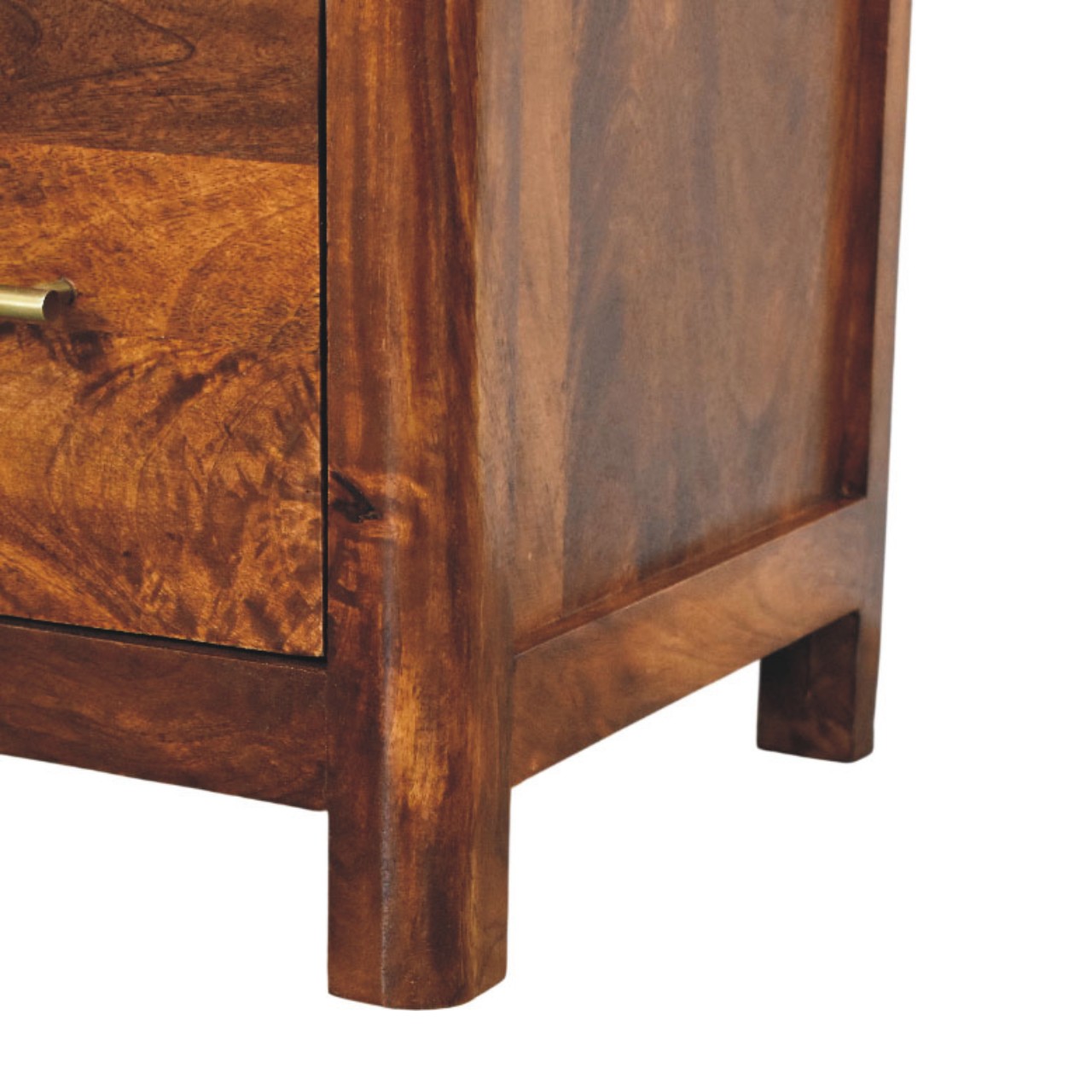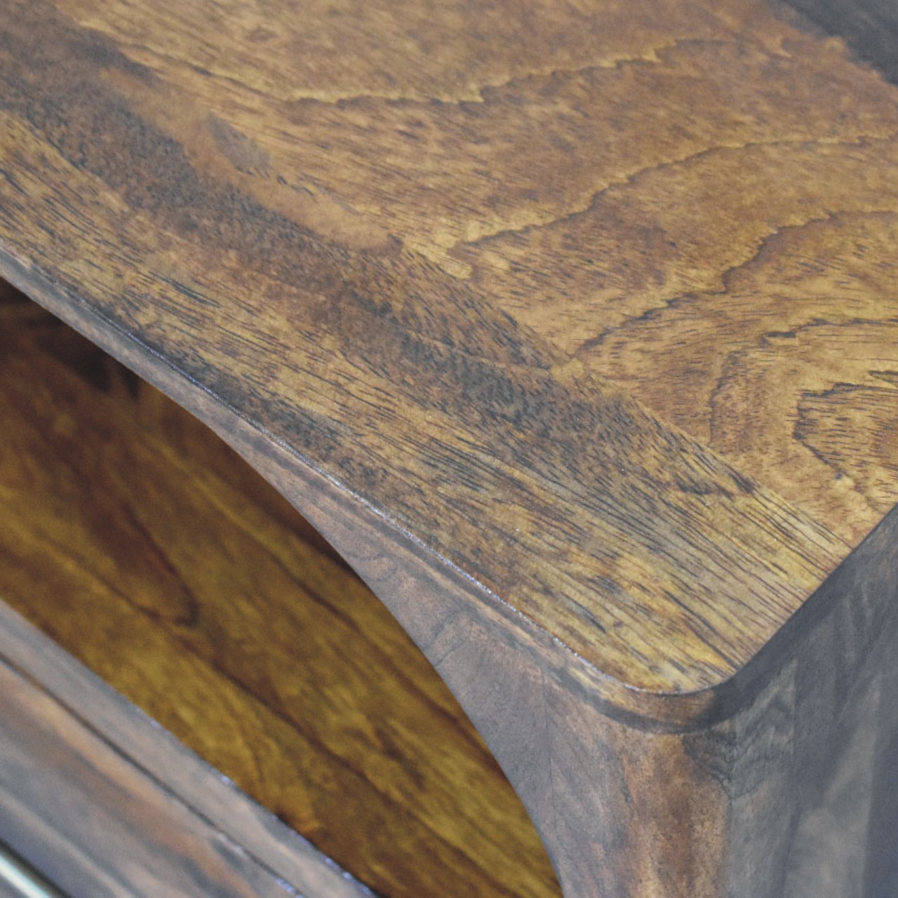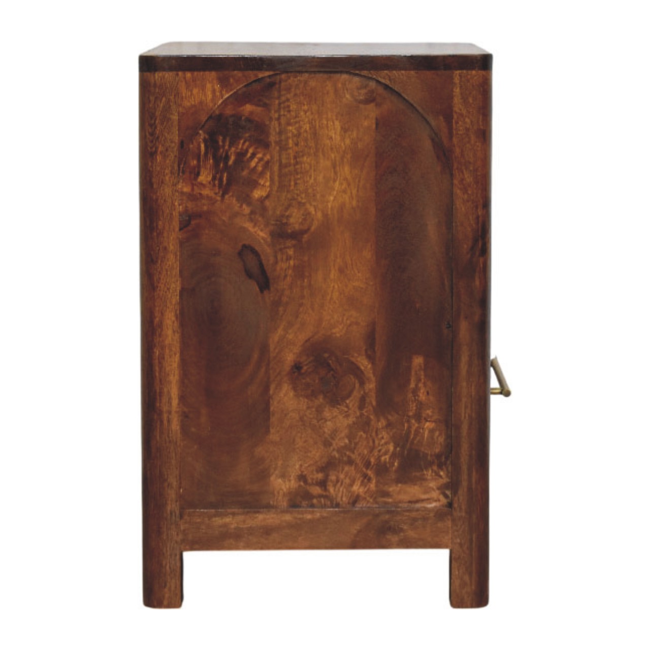 The Arc Bedside Table is a refined storage piece that balances softness and structure through its signature arched open shelf and clean, architectural form. Handcrafted from 100% solid mango wood and finished in a rich Chestnut tone, it highlights the natural grain of the timber while maintaining a calm, understated presence. A smooth-glide drawer with a slim brass handle offers discreet storage, while the open shelf provides easy access to nighttime essentials or styling pieces. Thoughtfully proportioned and timeless in design, the Arc Bedside Table brings warmth, function, and quiet elegance to modern and transitional bedrooms alike.