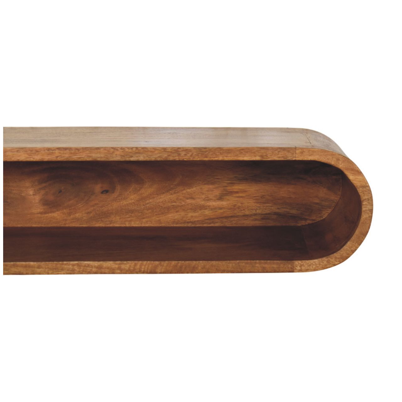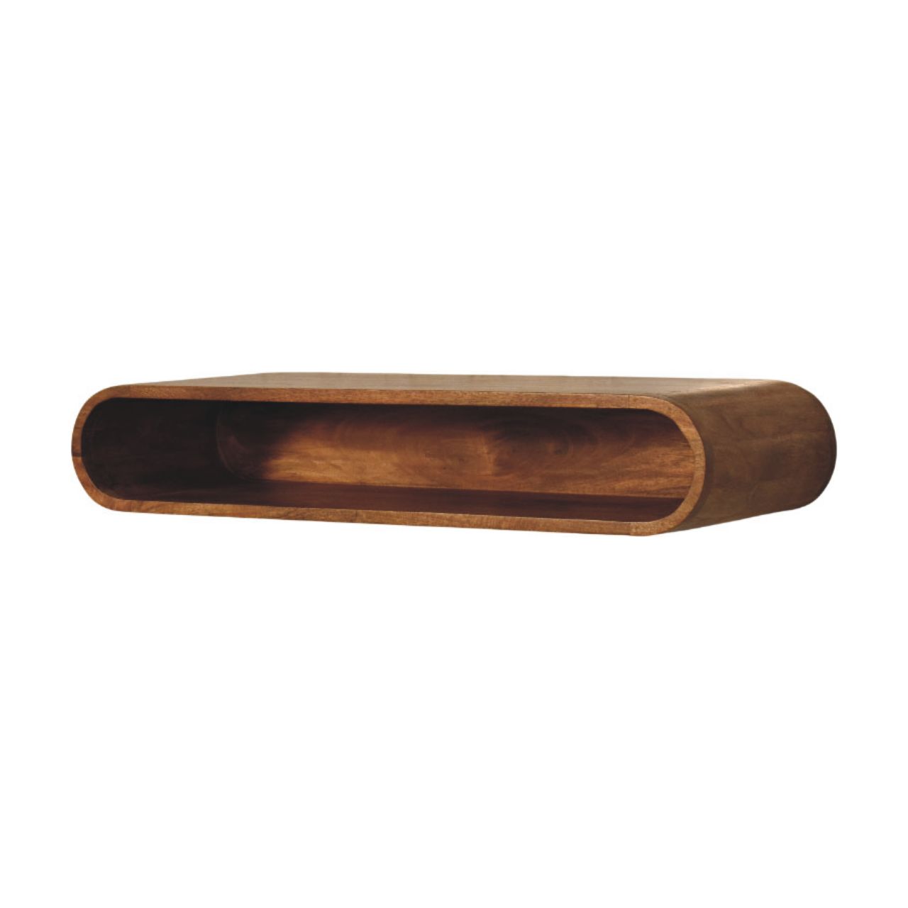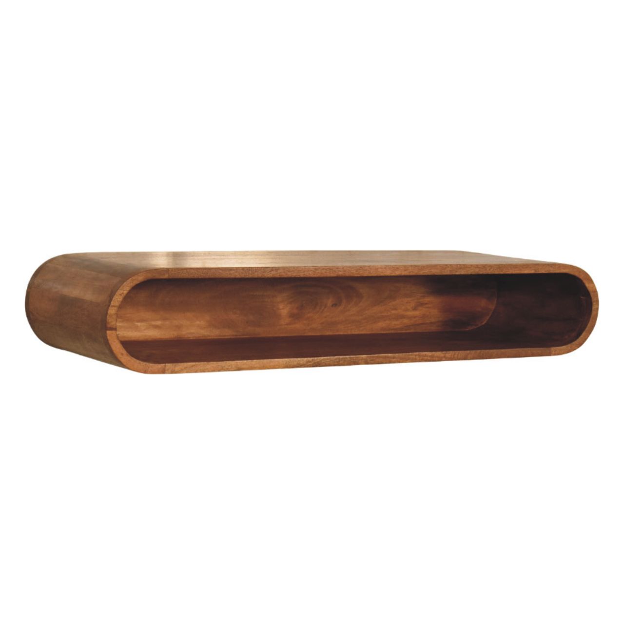 Designed to feel light, sculptural, and effortlessly modern, this wall-mounted media console is handcrafted from 100% solid mango wood and finished in a warm Amber Oak tone that highlights the natural grain of the timber. Its softly curved, continuous form creates a clean floating effect, making it ideal for contemporary living spaces where minimalism and craftsmanship go hand in hand. Perfect for media accessories, books, or decorative accents, the open shelf design keeps essentials within reach while maintaining a calm, uncluttered look. A refined statement piece, this console brings understated elegance and functional simplicity to walls in living rooms, bedrooms, or media areas.