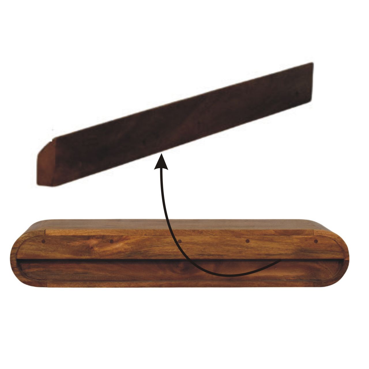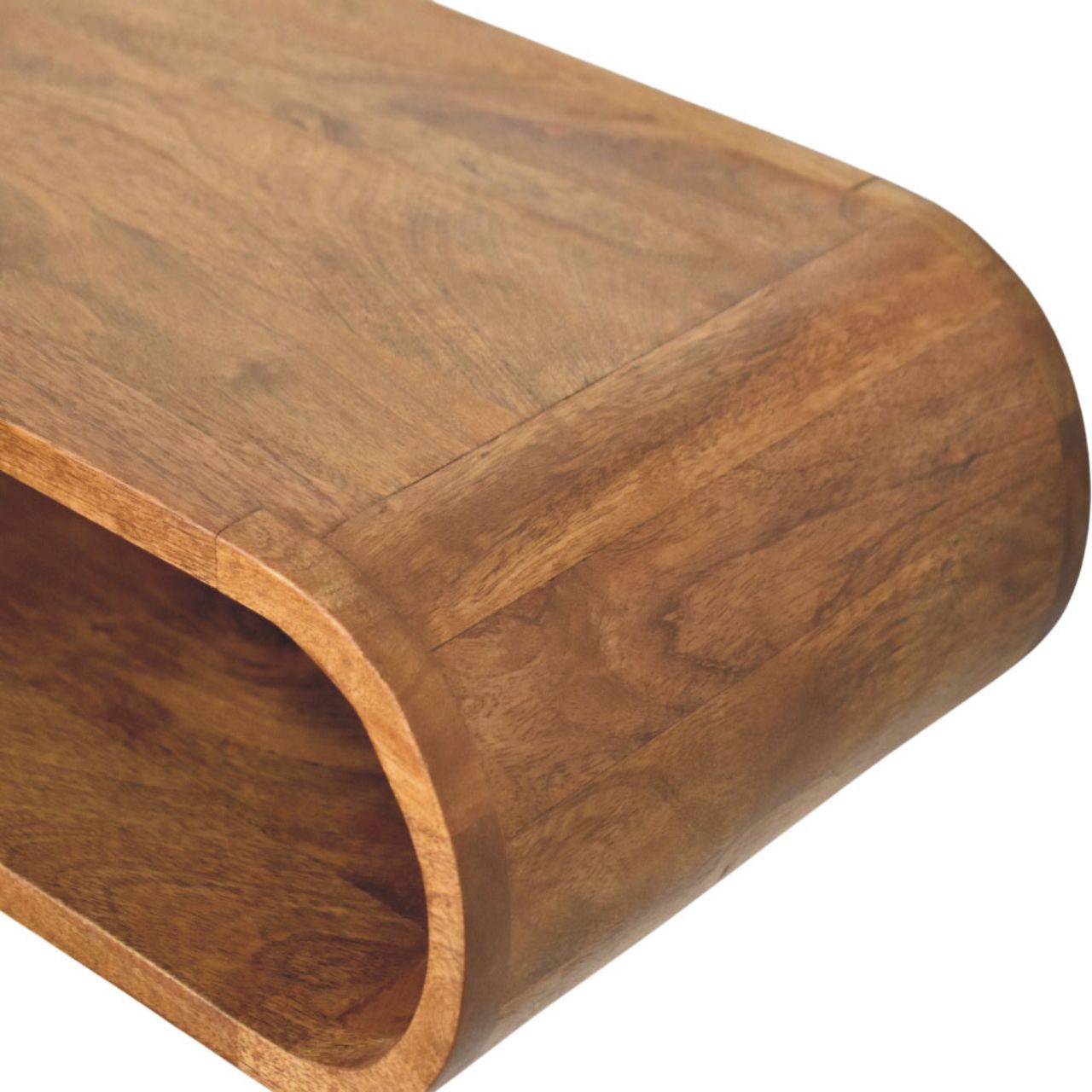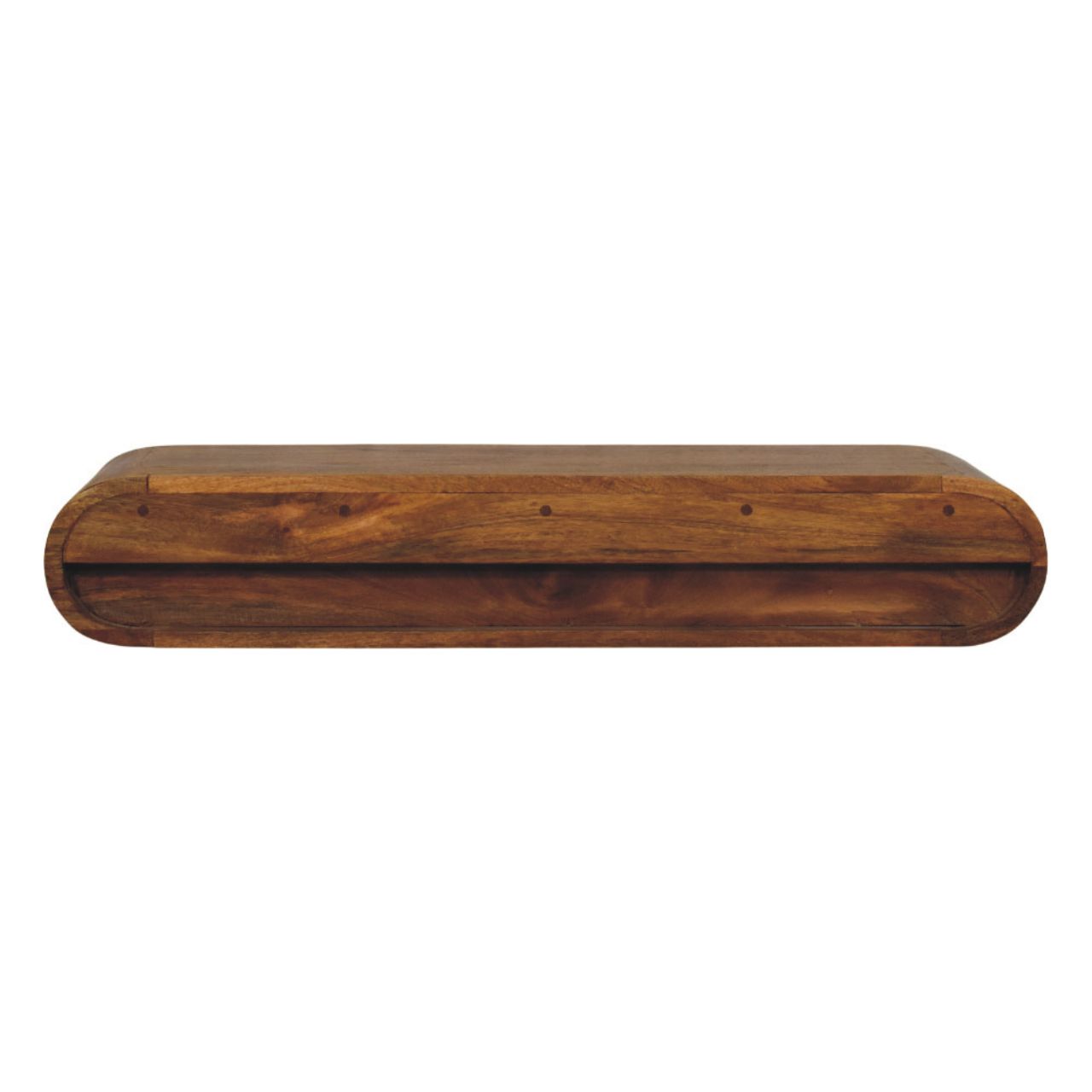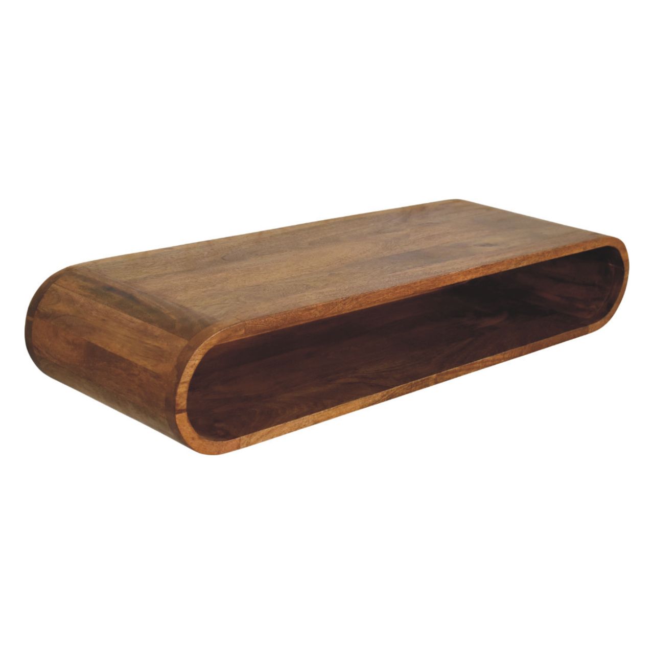 Designed to feel light, sculptural, and effortlessly modern, this wall-mounted media console is handcrafted from 100% solid mango wood and finished in a warm Amber Oak tone that highlights the natural grain of the timber. Its softly curved, continuous form creates a clean floating effect, making it ideal for contemporary living spaces where minimalism and craftsmanship go hand in hand. Perfect for media accessories, books, or decorative accents, the open shelf design keeps essentials within reach while maintaining a calm, uncluttered look. A refined statement piece, this console brings understated elegance and functional simplicity to walls in living rooms, bedrooms, or media areas.