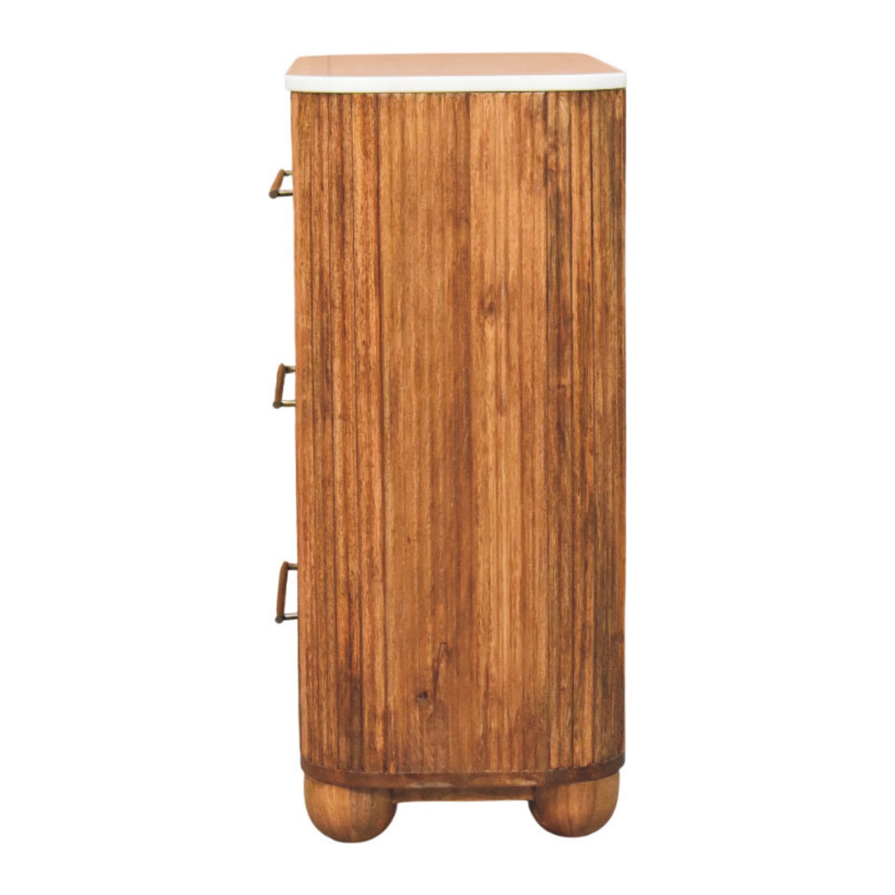 The Beaumont Marble Chest is a masterful expression of luxury and craftsmanship. Handcrafted from 100% solid mango wood in a warm Golden Teak finish, this exquisite piece features a pristine white marble top that exudes sophistication. The fluted texture along the front and sides enhances its artisanal character, while the four spacious drawers with sleek brass handles provide ample storage for your essentials. Resting on rounded ball feet, the Beaumont Marble Chest strikes a perfect balance between elegance and utility, making it a refined addition to any contemporary or classic interior.