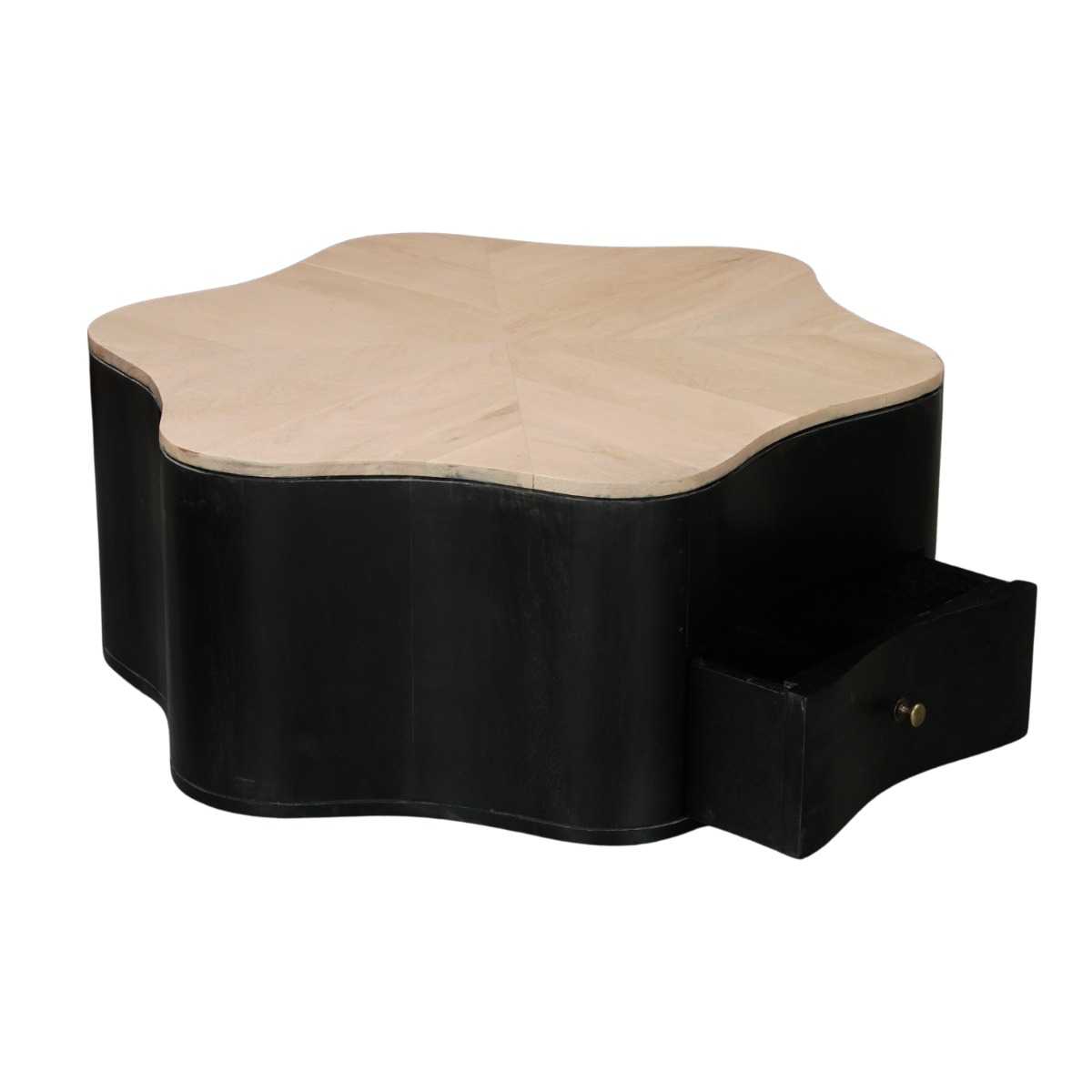 The Boho Wooden Star Coffee Table blends natural charm with modern style, making it a standout feature in any UK living room. Crafted by hand from sustainable mango wood, it features a unique star-shaped design with a warm honey-toned veneer top that shows off beautiful grain patterns and a subtle chevron detail. The light top pairs perfectly with a bold matte black base, adding contrast and elegance, while the softly curved edges balance its striking shape. A discreet soft-close drawer keeps bits like remotes, coasters, or magazines tucked away. Measuring 88?88?40 cm, it offers plenty of surface space without overpowering smaller rooms ? perfect for open-plan areas, snug lounges, or stylish family homes.