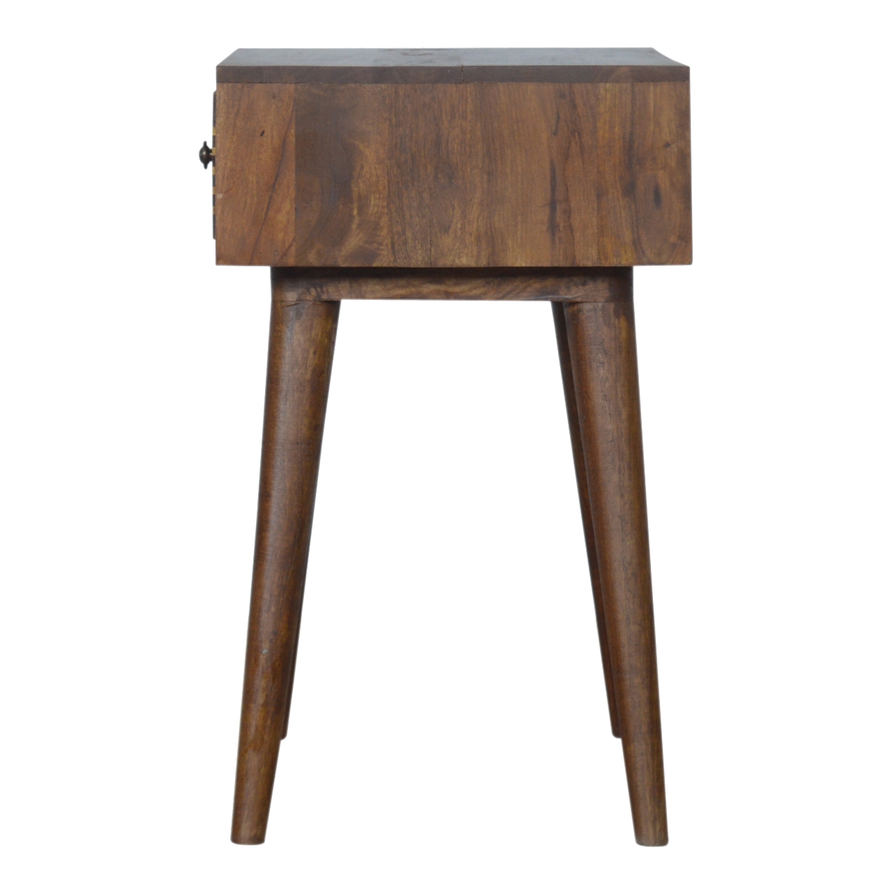 This bedside is endlessly versatile and will prove handy all over your home. It has been constructed from 100% solid mango wood in a beautiful chestnut finish. The main feature of this design is the brass inlay chevron pattern drawer complimenting the darker wood finish nicely. Some other features are the 4 Nordic style legs and 1 drawer for storing away any bits and pieces before bedtime. The perfect addition to the home.
