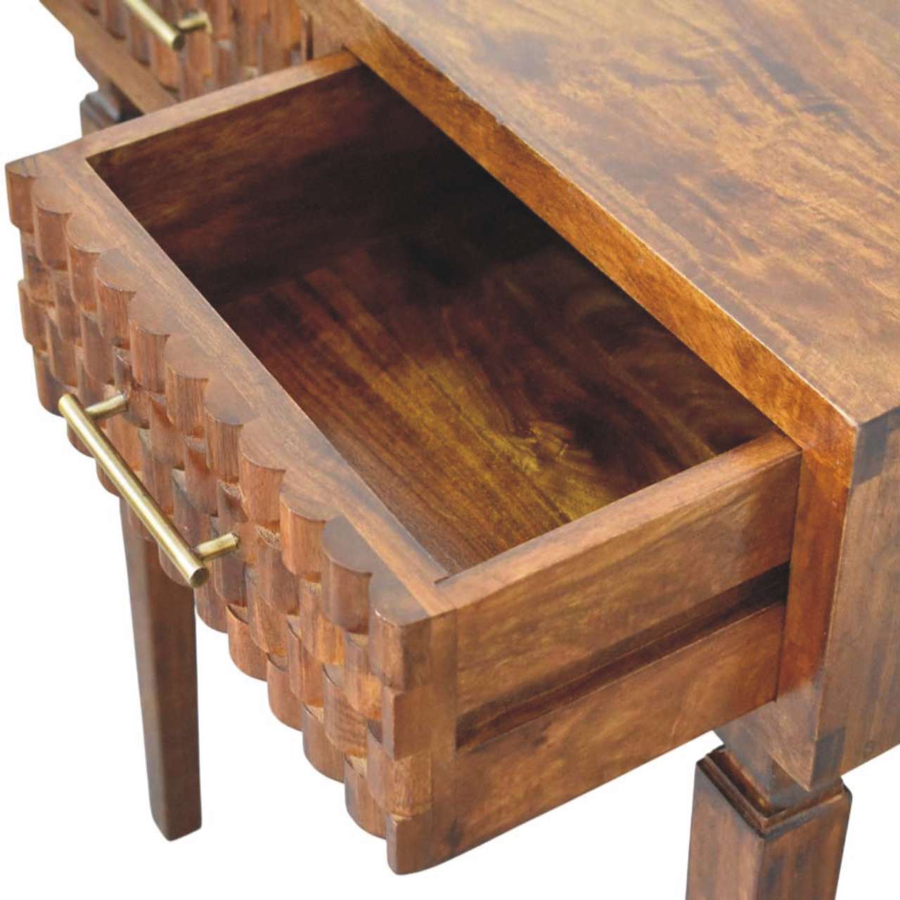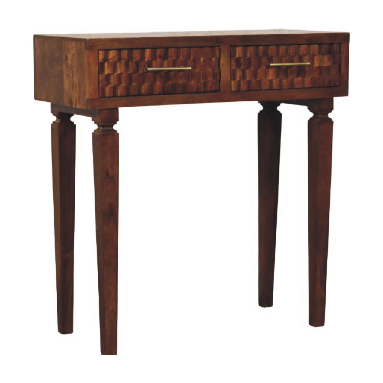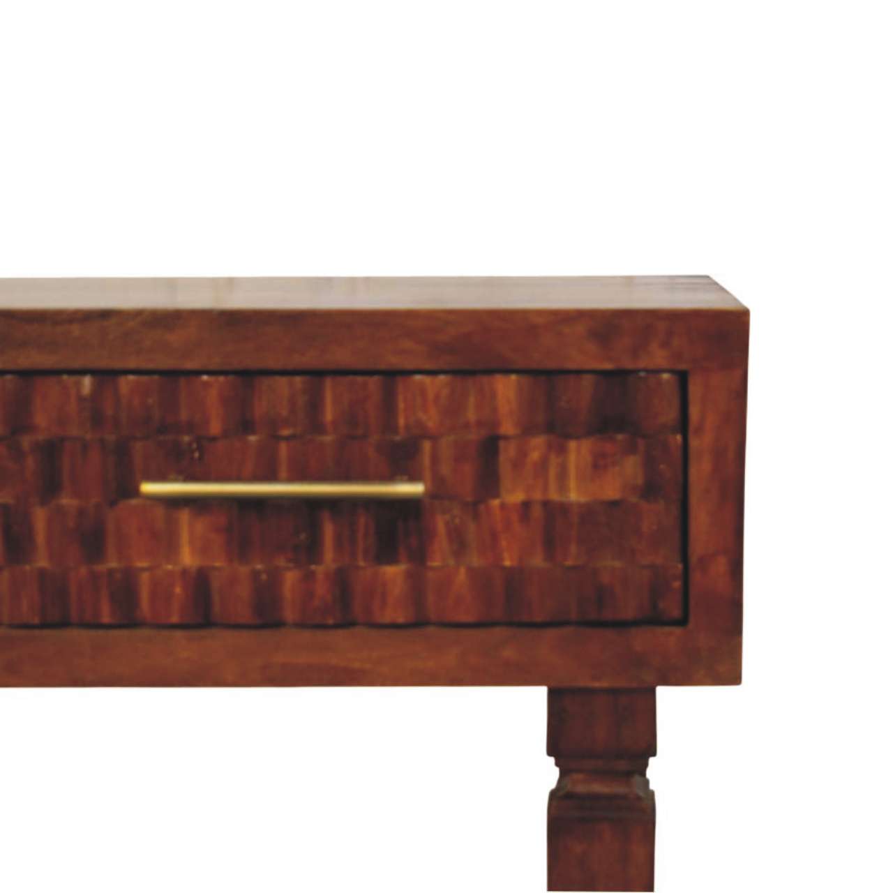 The Cadiz Textured Console Table is a striking blend of craftsmanship and character, handcrafted from 100% solid mango wood in a rich Chestnut finish. Its distinctive textured drawer fronts add depth and visual interest, while the sleek brass handles introduce a subtle touch of warmth and contrast. Designed with clean lines and balanced proportions, this console table offers practical surface space for styling or everyday essentials, making it ideal for hallways, living areas, or bedrooms. Timeless yet contemporary, the Cadiz Textured Console Table brings artisanal detail and understated elegance into any interior.