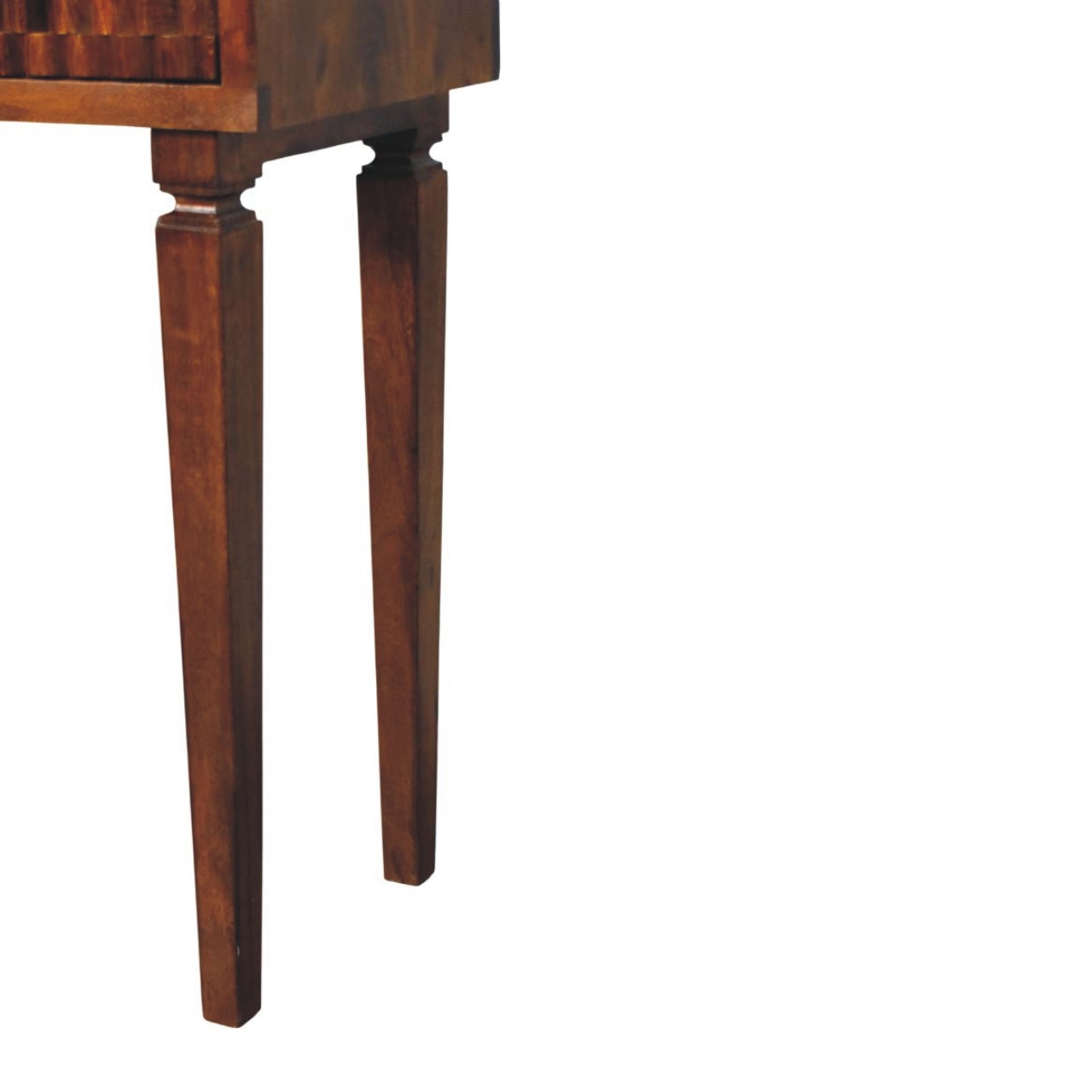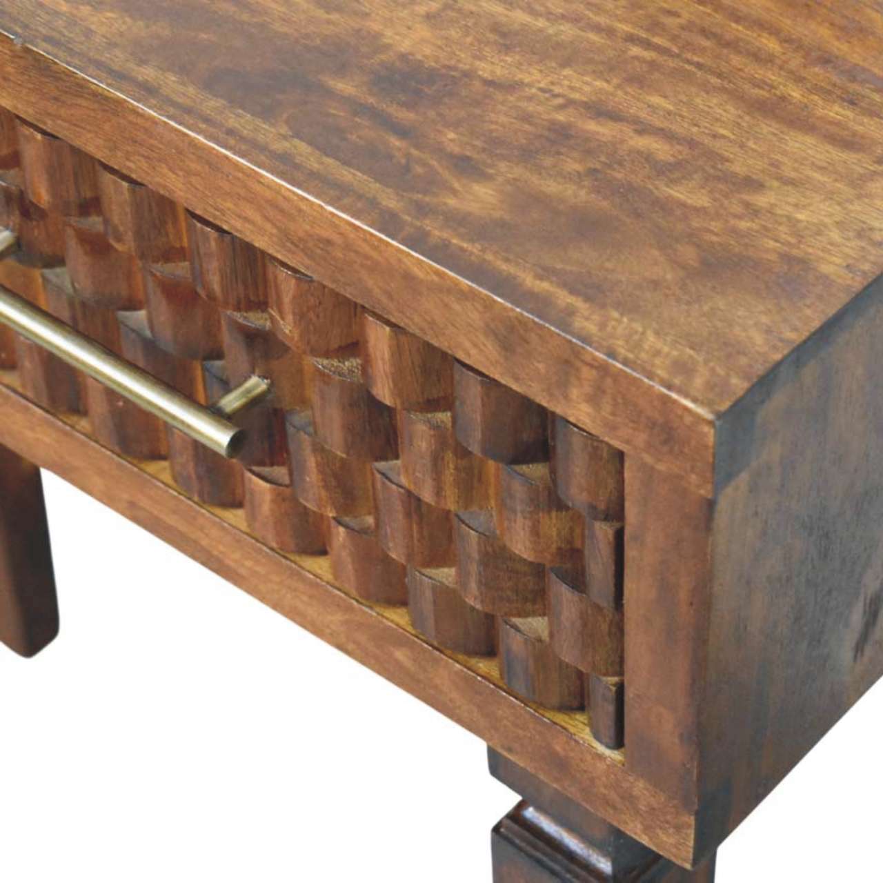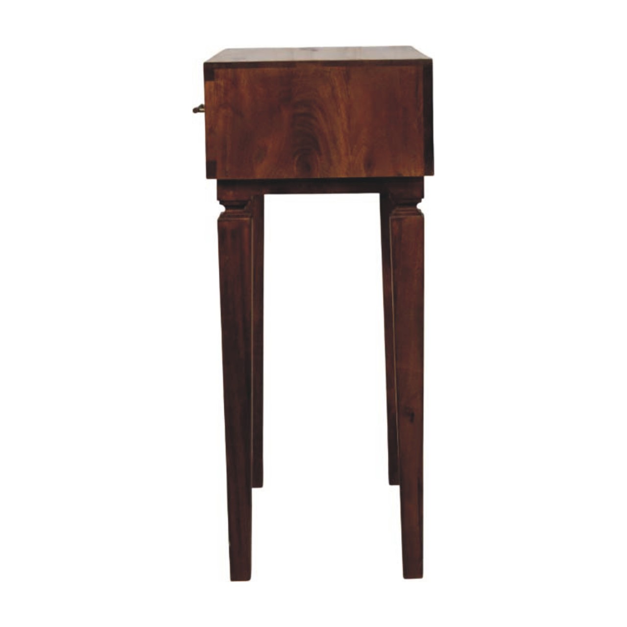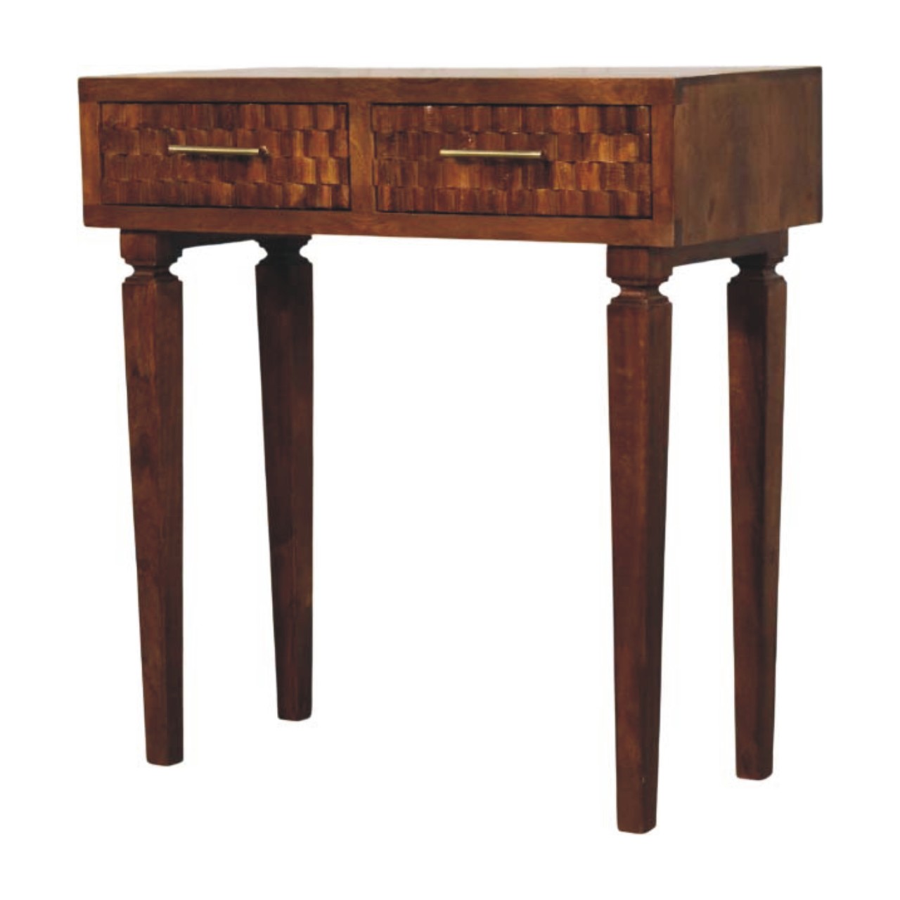 The Cadiz Textured Console Table is a striking blend of craftsmanship and character, handcrafted from 100% solid mango wood in a rich Chestnut finish. Its distinctive textured drawer fronts add depth and visual interest, while the sleek brass handles introduce a subtle touch of warmth and contrast. Designed with clean lines and balanced proportions, this console table offers practical surface space for styling or everyday essentials, making it ideal for hallways, living areas, or bedrooms. Timeless yet contemporary, the Cadiz Textured Console Table brings artisanal detail and understated elegance into any interior.