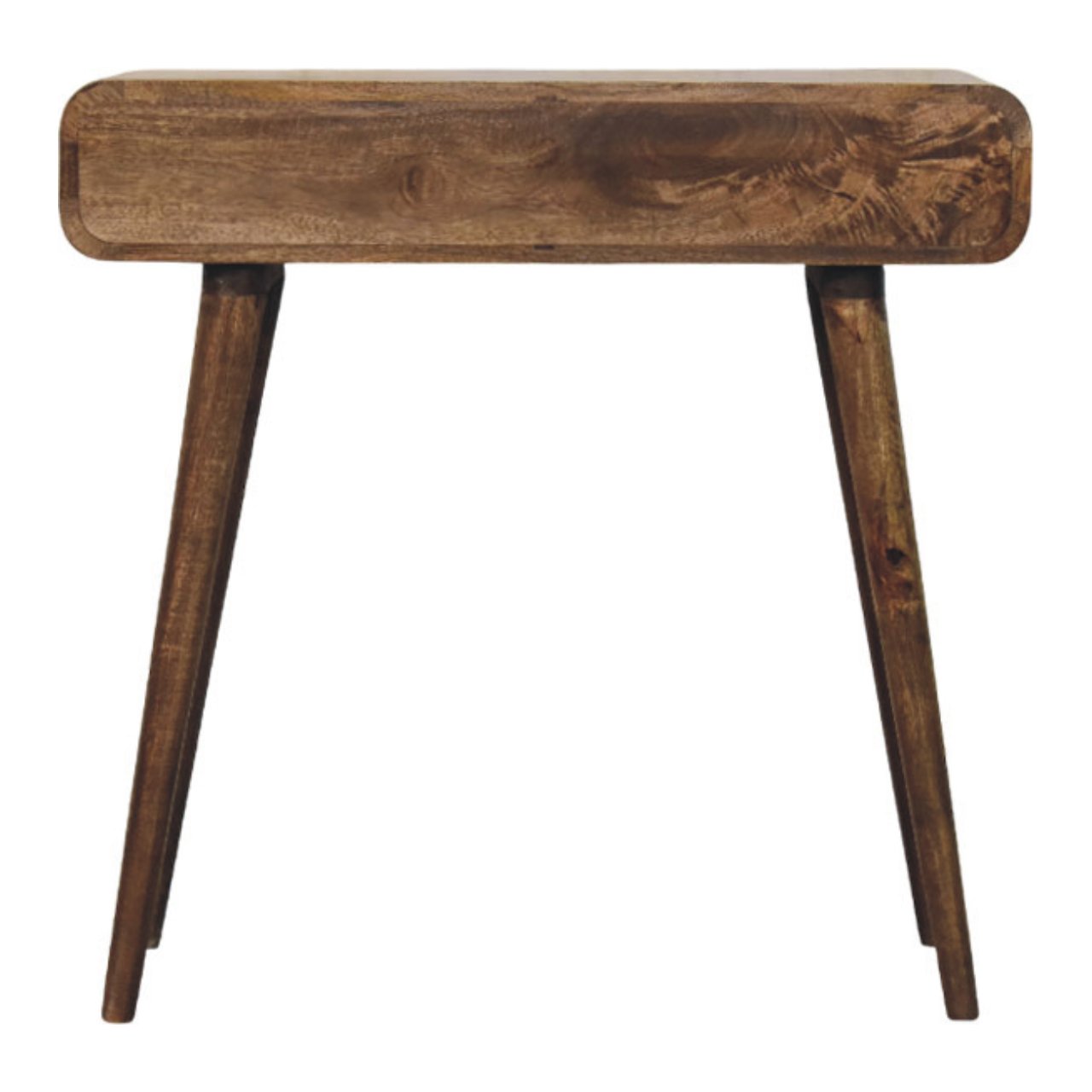 This sleek console table is crafted from 100% solid mango wood and finished in a rich Classic Grey tone that enhances its natural grain. Featuring soft rounded corners and two compact drawers with subtle brass knobs, it stands gracefully on Nordic-style legs for a refined mid-century silhouette. Perfect for hallways, entryways, or behind a sofa, this elegant piece brings functional charm and understated style to any interior space.