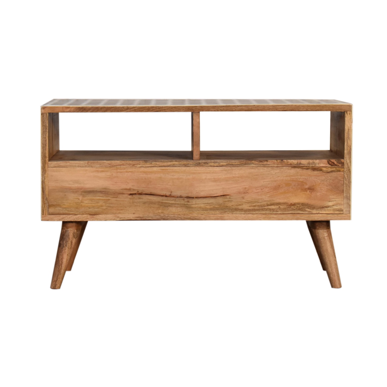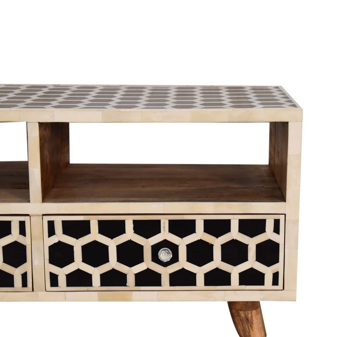 This media unit has a clean and simple design to suit most homes. This piece has a lovely oak finish finish and features 2 bone inlay drawer fronts which have a honeycomb pattern and 2 glass knobs. It provides 2 open slots and 2 drawers for extra storage. Some other features 4 Scandinavian style legs.