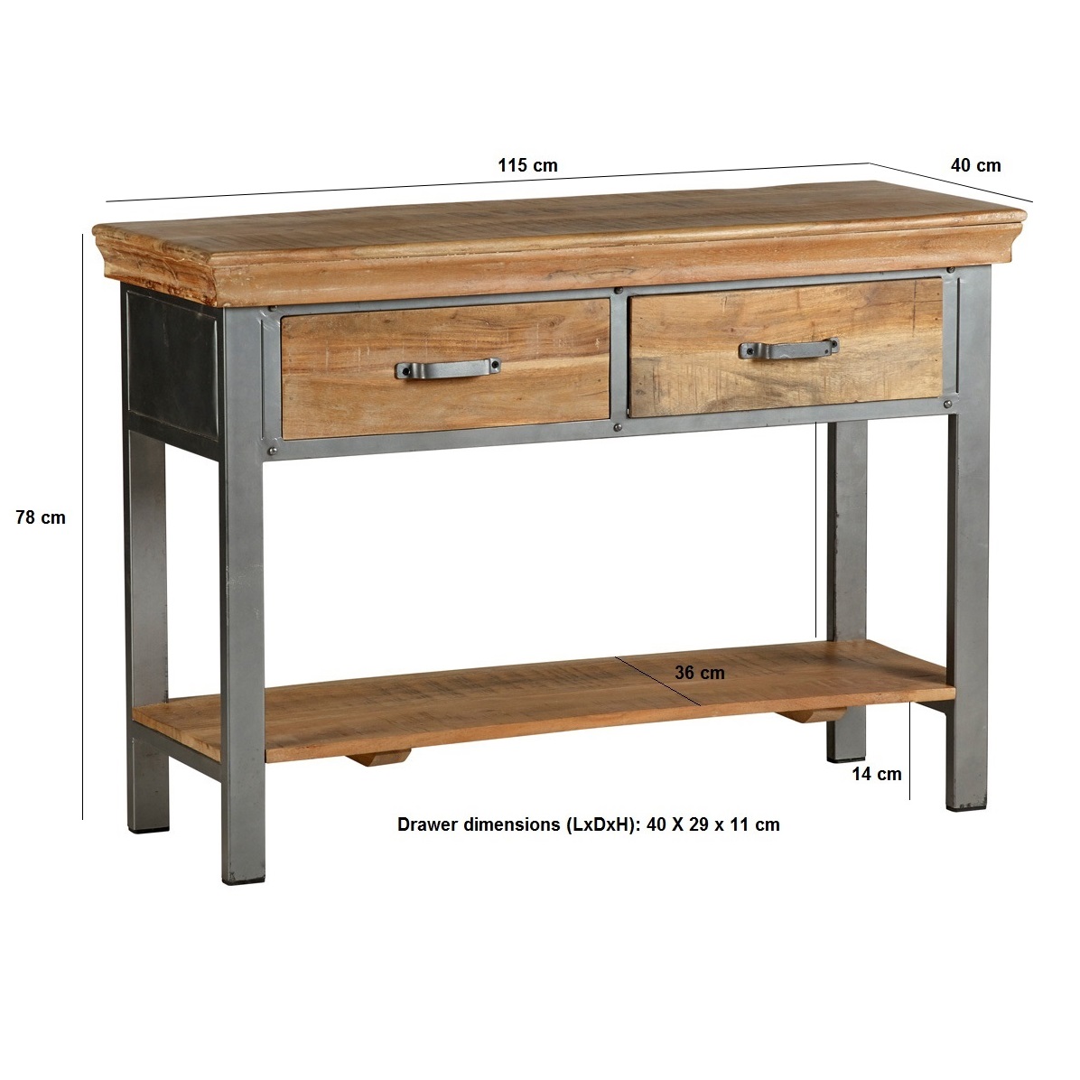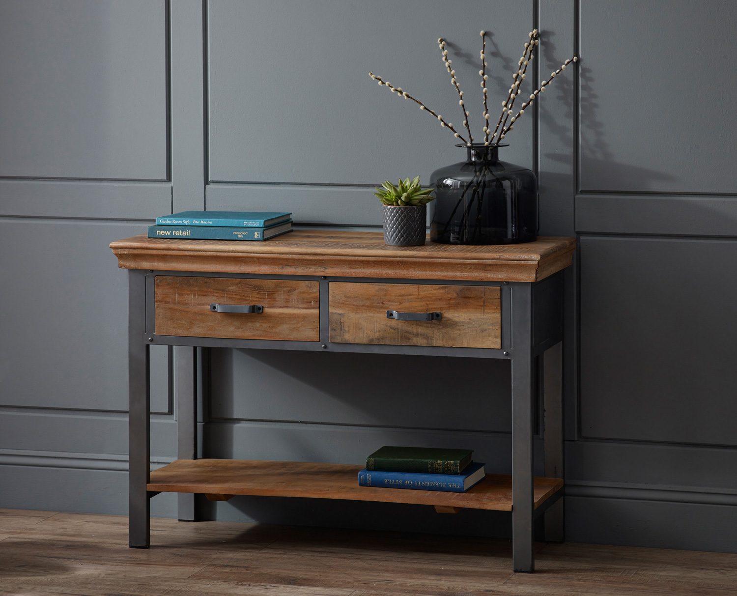This modern solid wood and metal style furniture is created by skilled craftsmen using reclaimed metal and slightly distressed wood. The solid wood features sandblasted white stain in combination with gun metal patina applied to the metal frames, creating a very modern and versatile range.