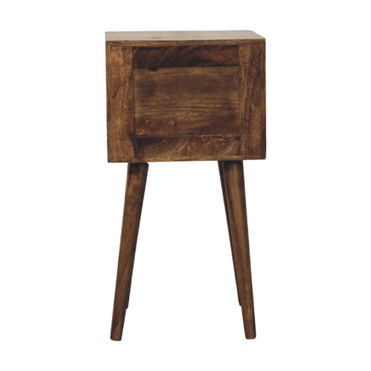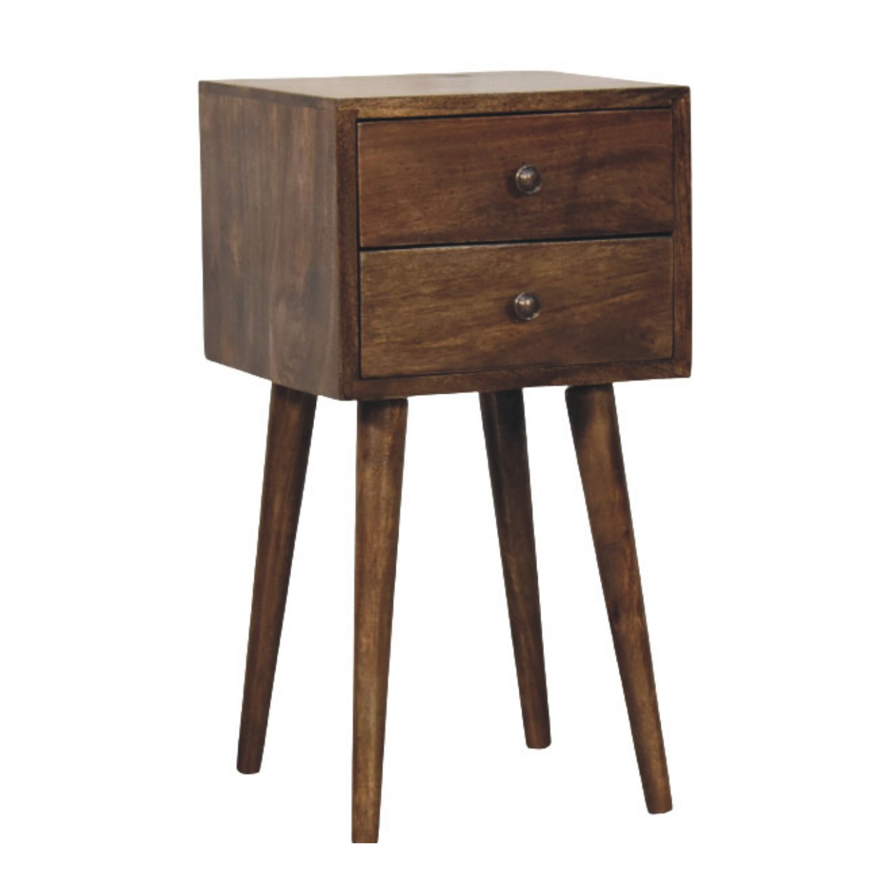 Crafted from 100% solid mango wood and finished in a rich Classic Grey tone, this sleek bedside table combines mid-century charm with modern practicality. Its two compact drawers offer convenient bedside storage, accented with understated round knobs. Supported by signature Nordic-style tapered legs, this timeless piece effortlessly complements both contemporary and vintage-inspired interiors, making it a stylish and functional addition to any bedroom.