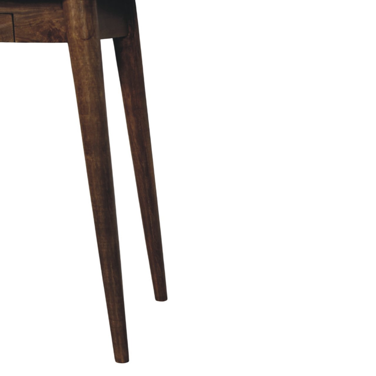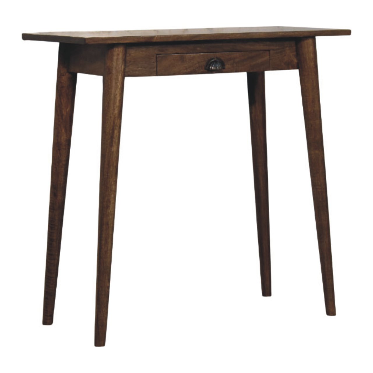 This Nordic-style writing desk is crafted from 100% solid mango wood and finished in a sophisticated Classic Grey tone. Featuring a slim silhouette and gently tapered legs, it offers a compact yet elegant workspace for any home office, study, or hallway. The single drawer with a vintage-style shell handle provides just the right amount of storage for writing essentials or small accessories. A timeless design that blends simplicity and style with everyday function.