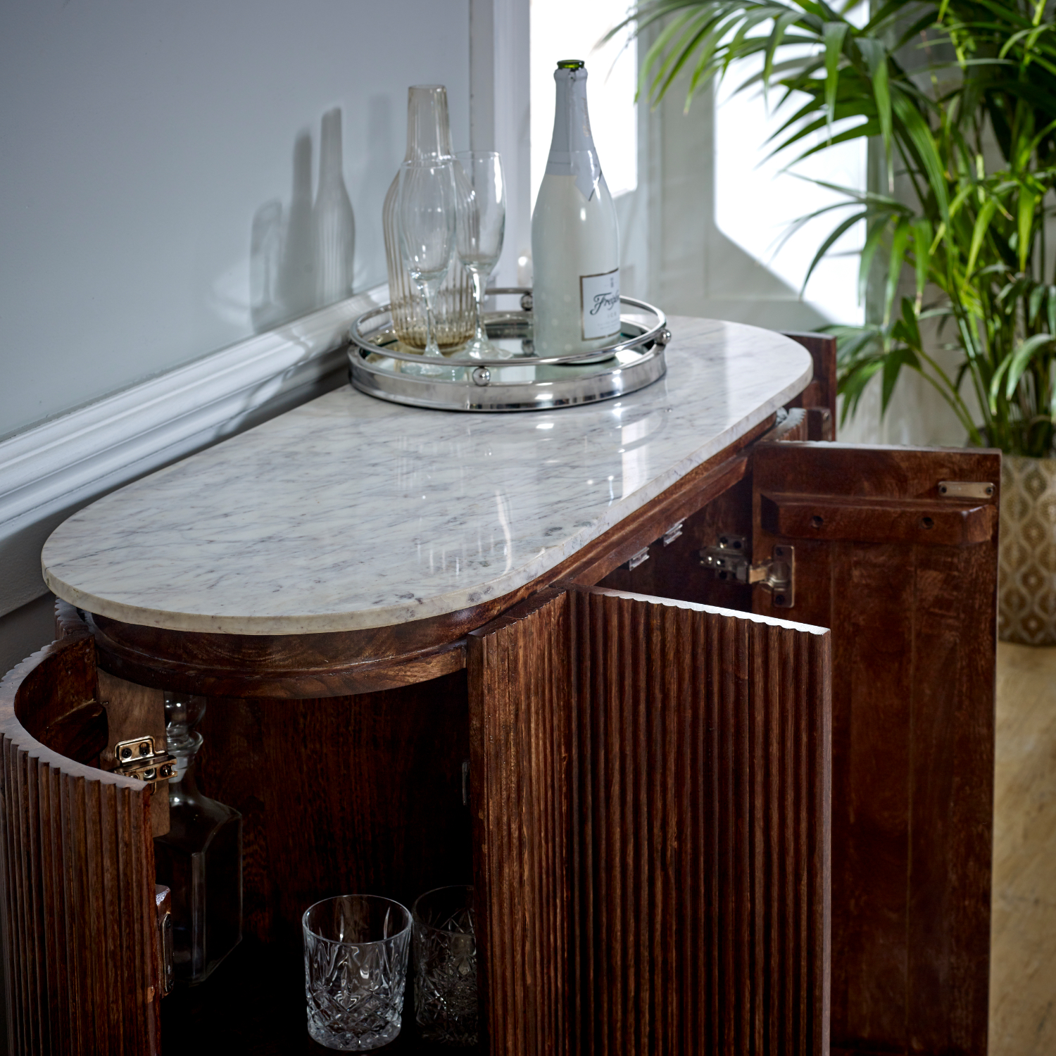 The sleek and stylish design of this sideboard / drinks cabinet hide a multitude of storage behind the doors. Featuring 4 doors there is ample shelving available for drinks bottles and glasses, or double as a sideboard for books / games etc. The elegant marble top will stand the test of time and the Artwork fluted mango wood surround compliments it perfectly. Sturdy metal legs complete the look of this item which is completely handmade by our skilled craftsmen in India using eco friendly materials. It is a beautiful piece of furniture for any room in your home.