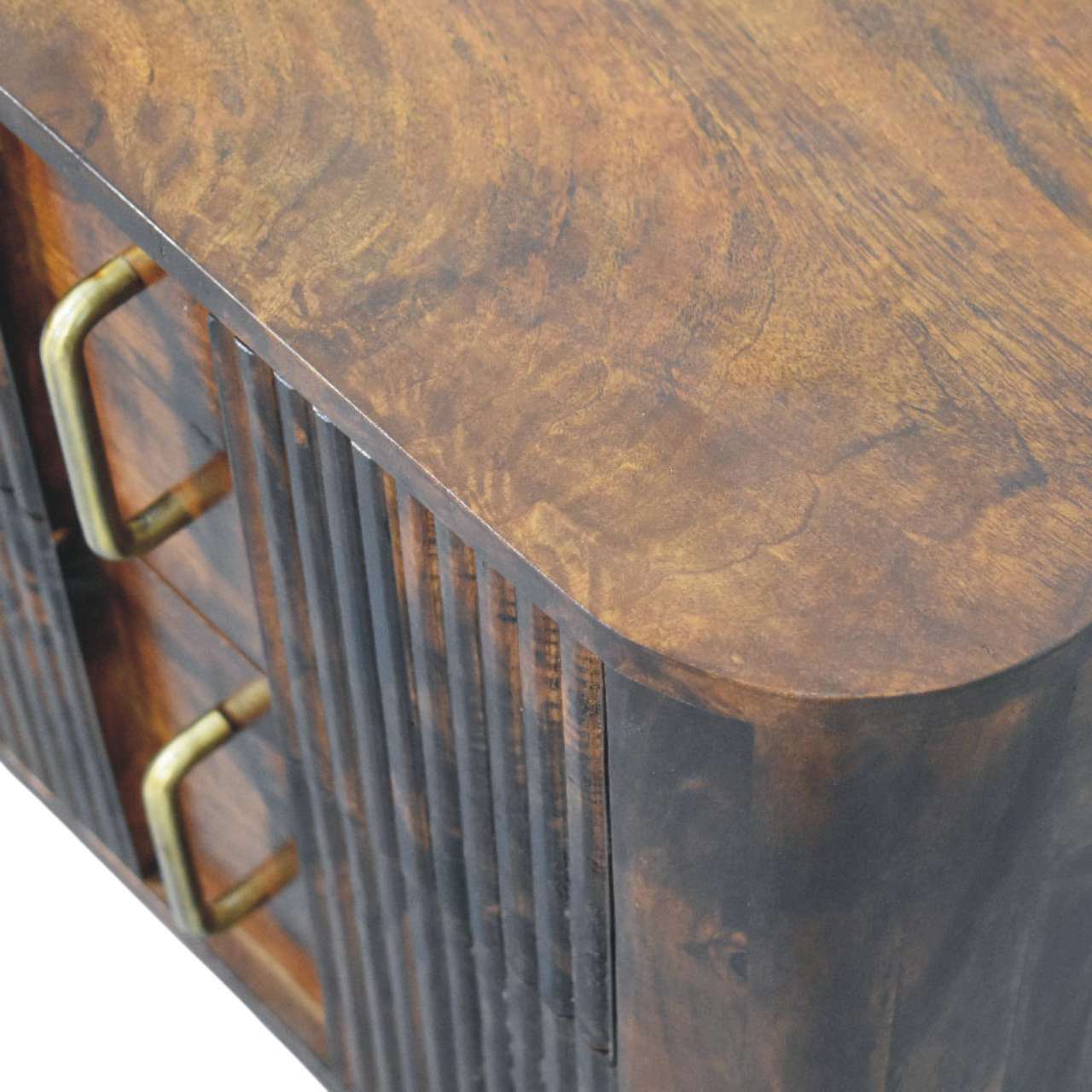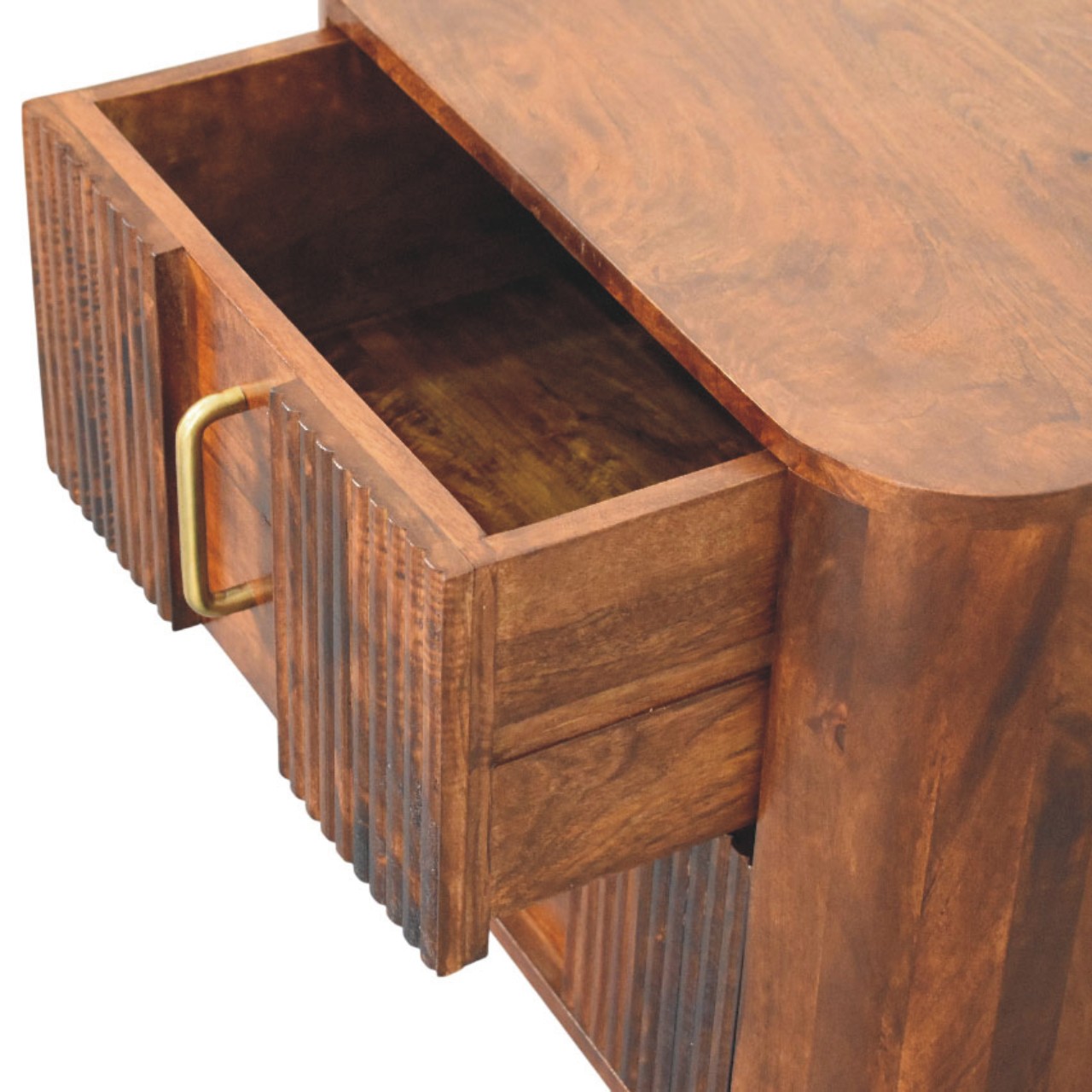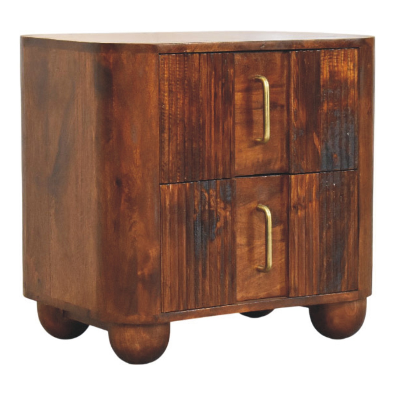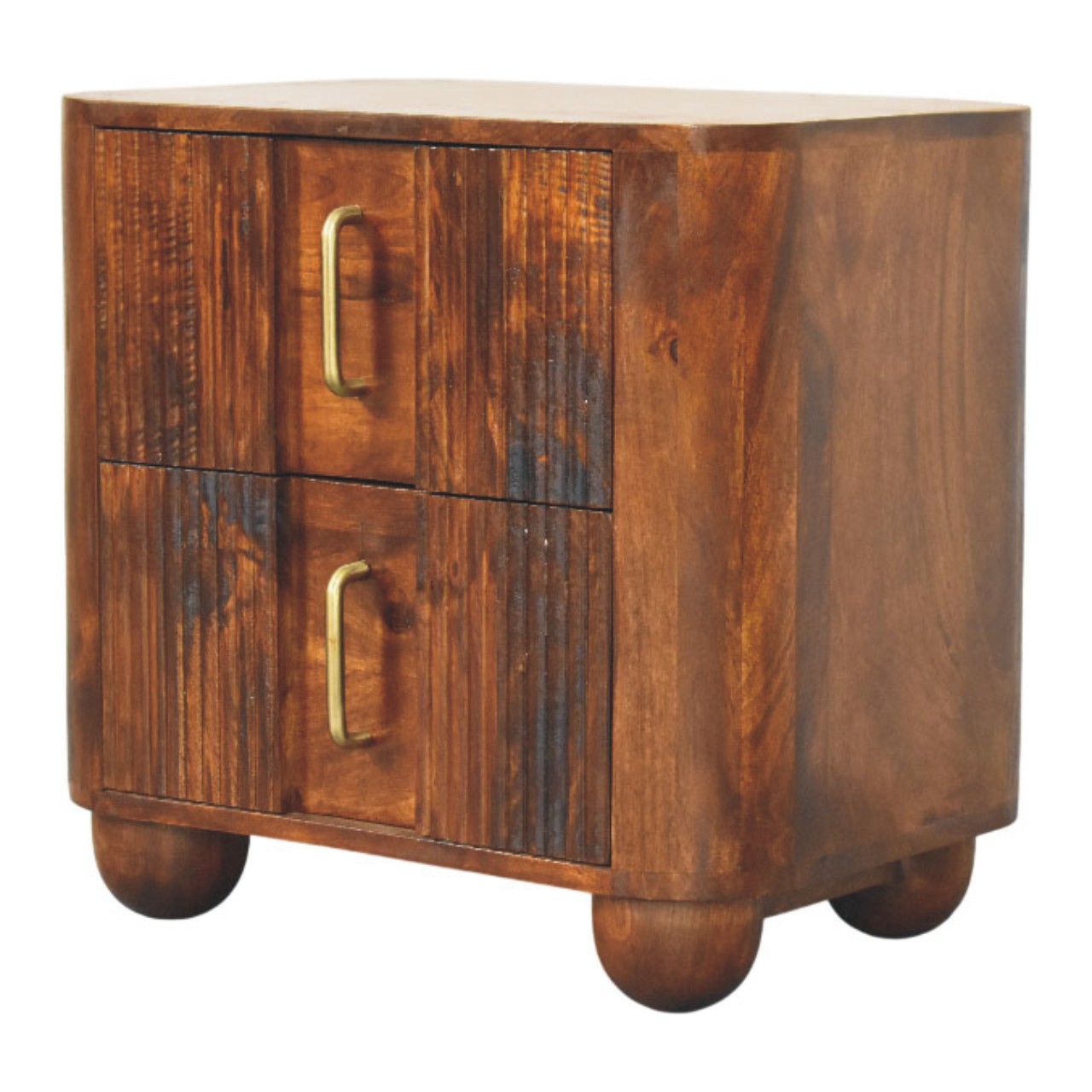 The Ribera Bedside Table is a compact yet characterful storage piece, handcrafted from 100% solid mango wood and finished in a rich Chestnut tone. Its softly rounded silhouette is paired with vertically ribbed drawer fronts, adding subtle texture and depth without overpowering the design. Two neatly proportioned drawers offer practical bedside storage, while the gently curved edges and solid form create a calm, balanced presence. Designed to sit effortlessly in both contemporary and classic interiors, this bedside table brings warmth, craftsmanship, and understated elegance to the bedroom.