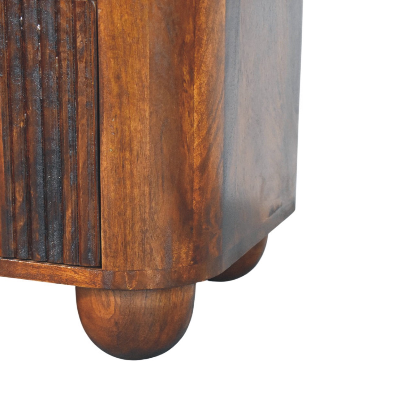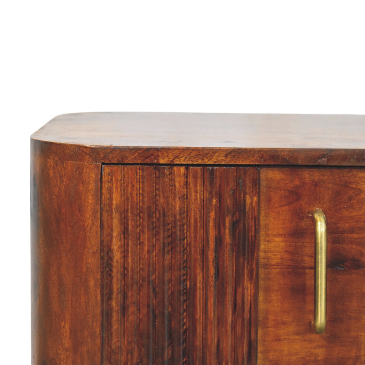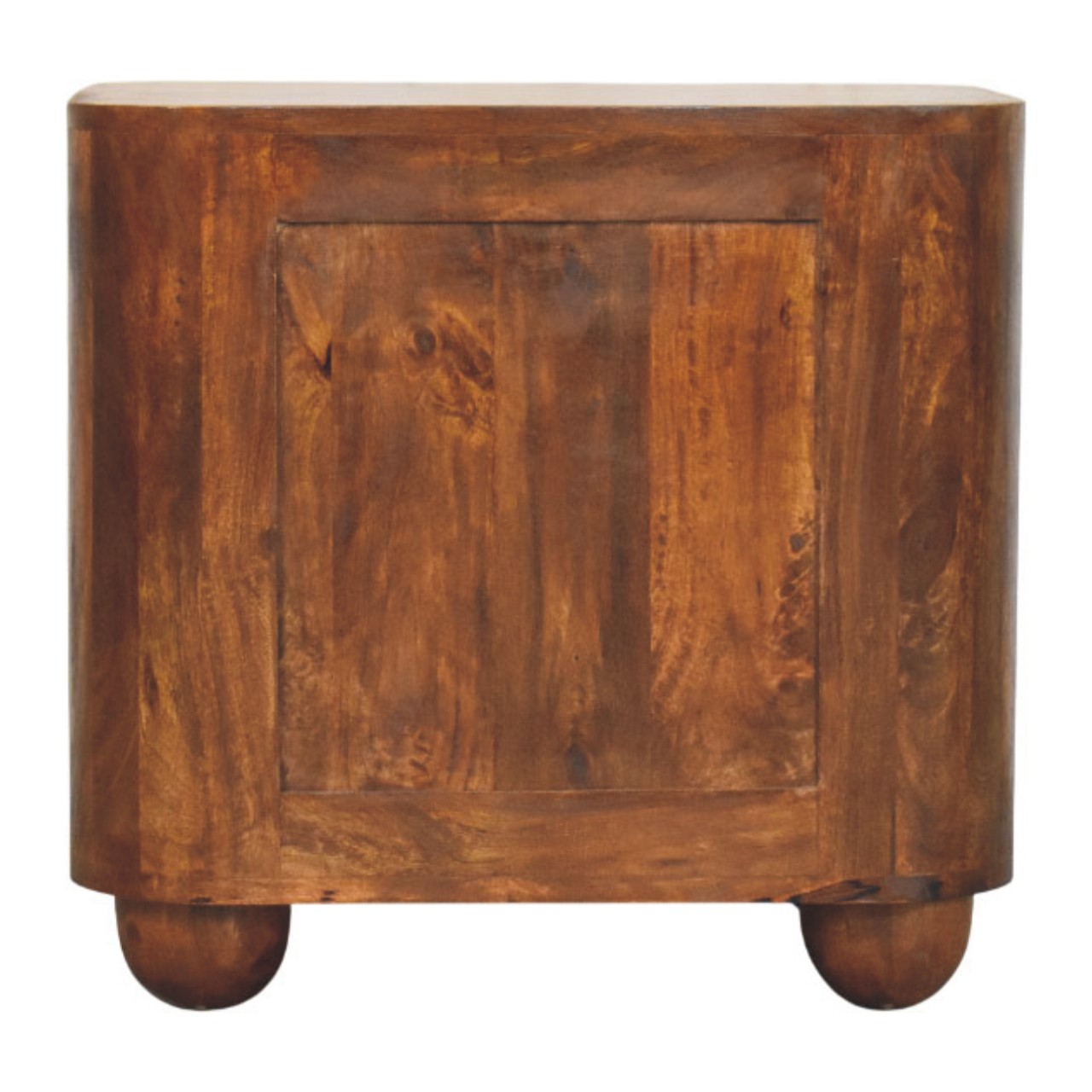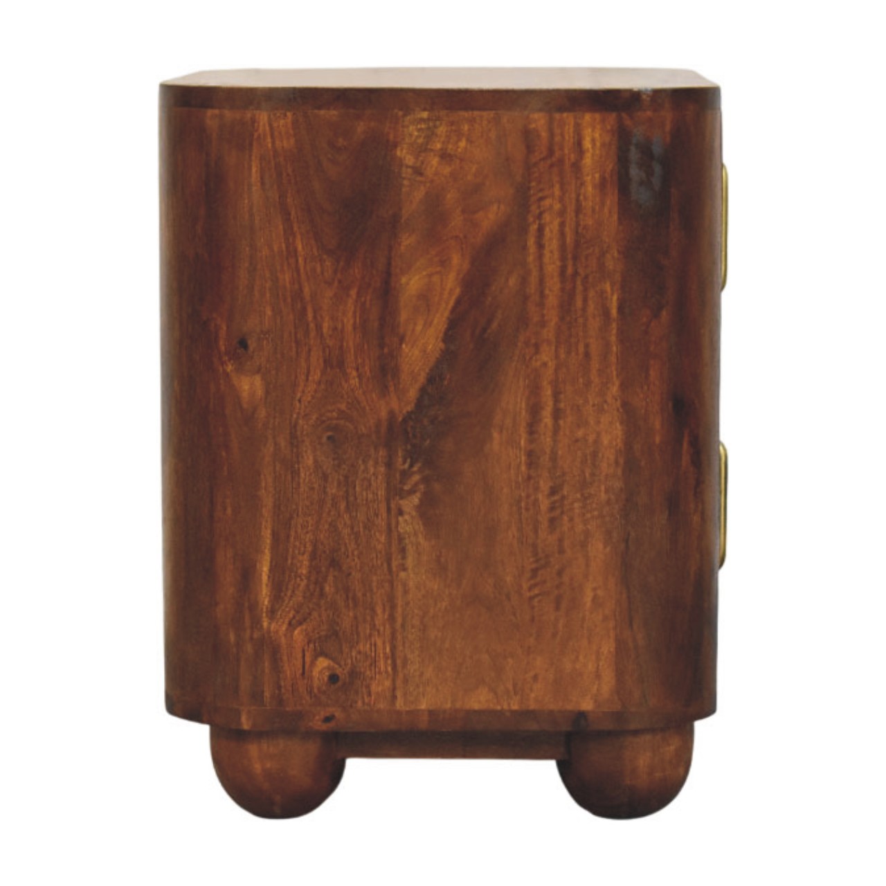 The Ribera Bedside Table is a compact yet characterful storage piece, handcrafted from 100% solid mango wood and finished in a rich Chestnut tone. Its softly rounded silhouette is paired with vertically ribbed drawer fronts, adding subtle texture and depth without overpowering the design. Two neatly proportioned drawers offer practical bedside storage, while the gently curved edges and solid form create a calm, balanced presence. Designed to sit effortlessly in both contemporary and classic interiors, this bedside table brings warmth, craftsmanship, and understated elegance to the bedroom.