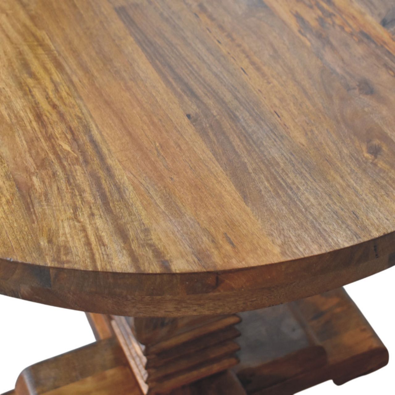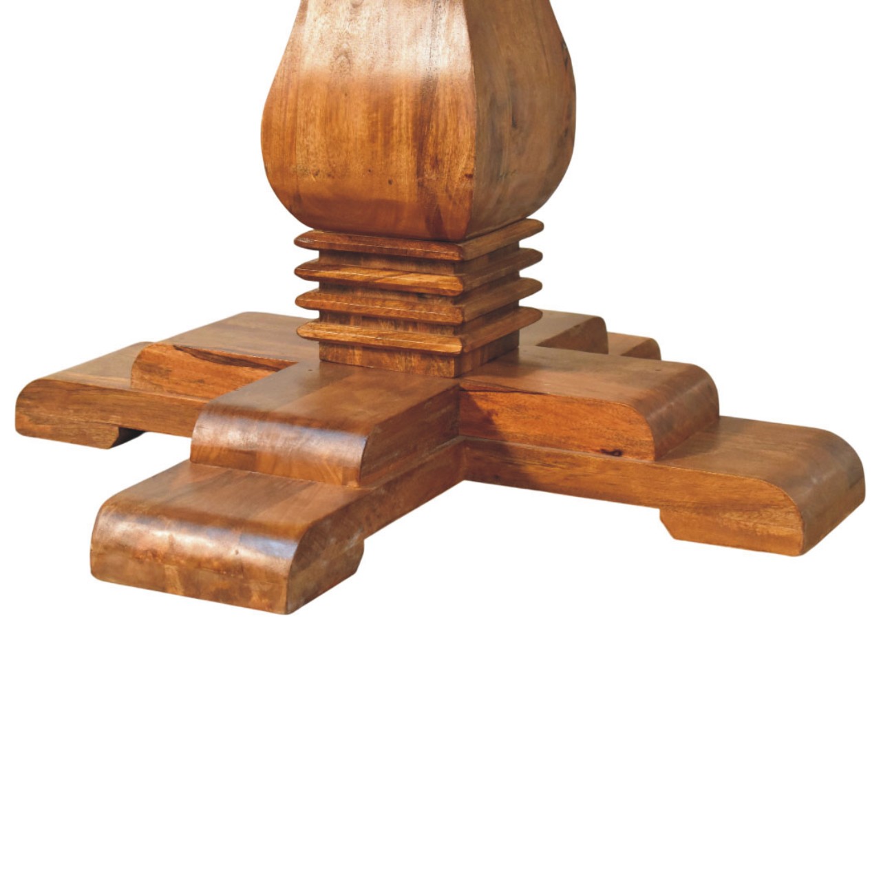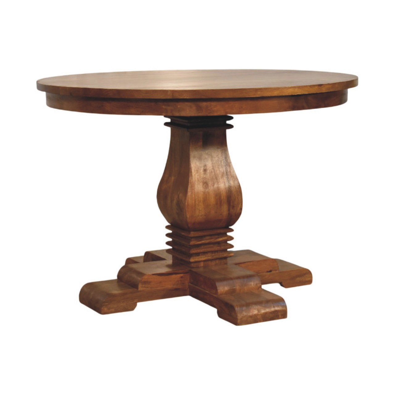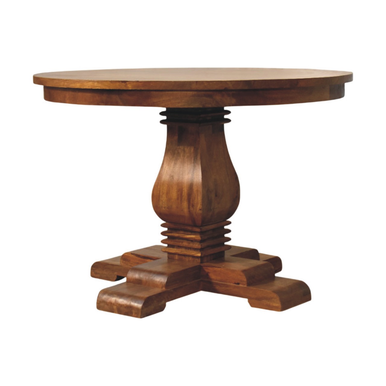 Timeless and beautifully grounded, this round dining table is handcrafted from 100% solid mango wood and finished in a warm Amber Oak tone that enhances the natural character and movement of the grain. The generously proportioned circular top is supported by a sculpted pedestal base with a classic cross-foot foundation, offering both stability and architectural elegance. Its balanced silhouette allows for comfortable seating while creating an inviting focal point for shared meals and conversation. Designed to suit both traditional and contemporary interiors, this dining table brings enduring craftsmanship, warmth, and understated sophistication to the heart of the home.