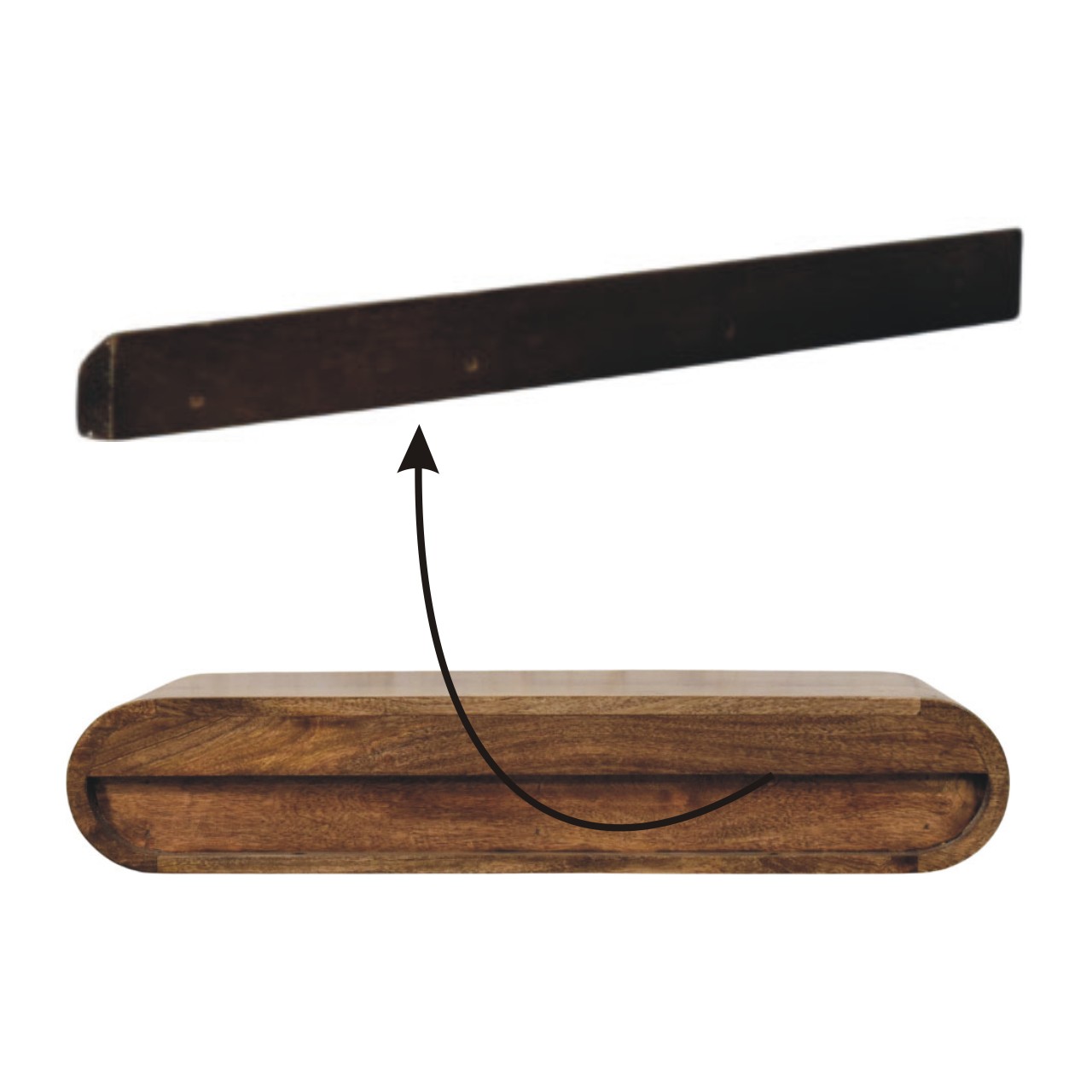 Crafted from 100% solid mango wood in a smooth Classic Grey finish, this wall-mounted console showcases a unique rounded-edge silhouette that brings modern elegance to any hallway or living space. Featuring two discreet drawers with subtle brass knobs, it provides convenient storage while maintaining a clean, floating appearance. Perfect for entryways, minimalist offices, or under a mirror, this console combines sleek form with everyday function.