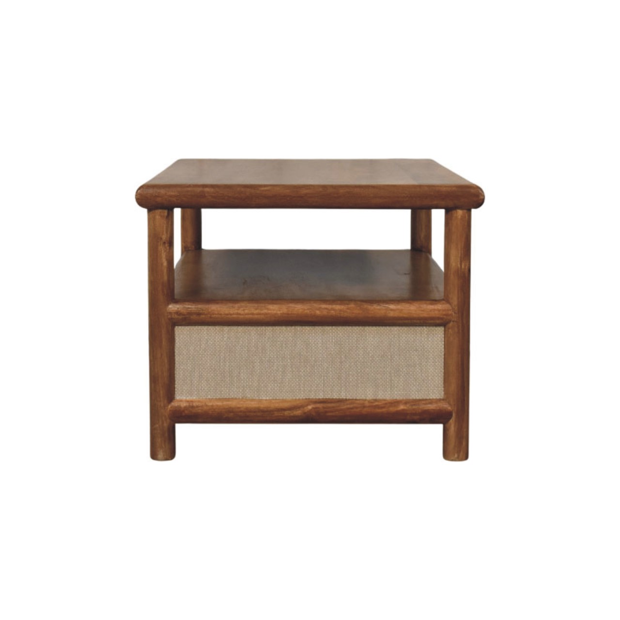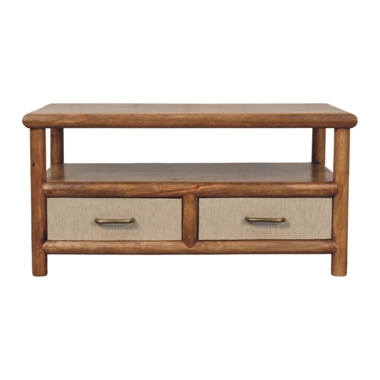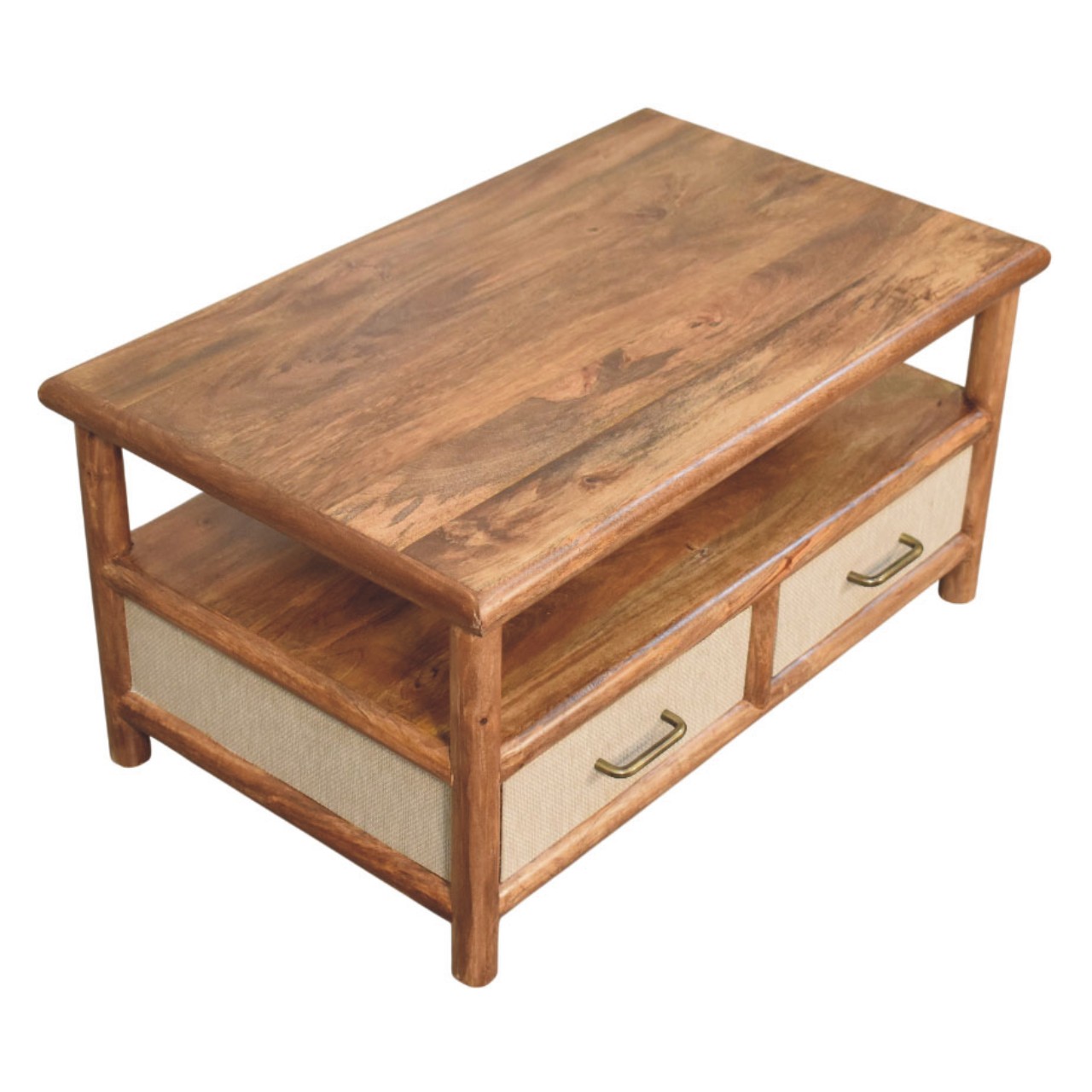 The Solara Rattan Coffee Table is a refined blend of solid form and contemporary texture, designed to anchor the living space with quiet confidence. Expertly handcrafted from 100% solid mango wood, this piece features gently rounded edges, an open lower shelf, and two functional drawers detailed with a newly developed woven rattan panel that adds depth and tactile interest. Finished in a warm Golden Teak tone, the natural grain of the wood complements the soft, structured rattan beautifully, creating a balanced and timeless aesthetic. Thoughtfully proportioned and effortlessly versatile, the Solara Rattan Coffee Table offers practical storage while elevating everyday living with understated elegance.