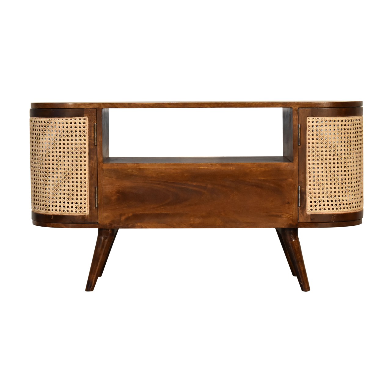 This stylish Nordic Woven Media Unit combines 2 woven cabinets with a smooth chestnut finish body and legs. Constructed from 100% solid mango legs it has a shiny brass knob on the drawer and nordic style legs. Make full use of this media unit in the living room and partner it with the rest of the collection.