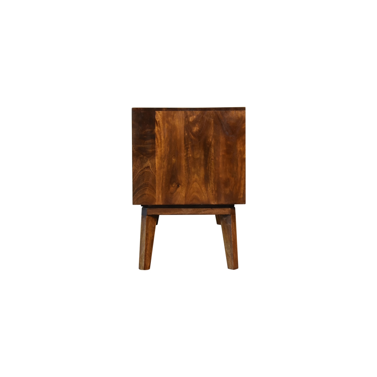 Want to add a Scandi vibe to your home? Our Samara Media Unit provides storage with open and closed slots and is ideal for modern and contemporary living rooms or bedrooms, designed for you to keep all of your belongings close by. This gorgeous piece has been constructed from 100% solid mango wood in a chestnut finish and features a carved diamond brass inlay pattern on the doors along with shiny brass knobs.
