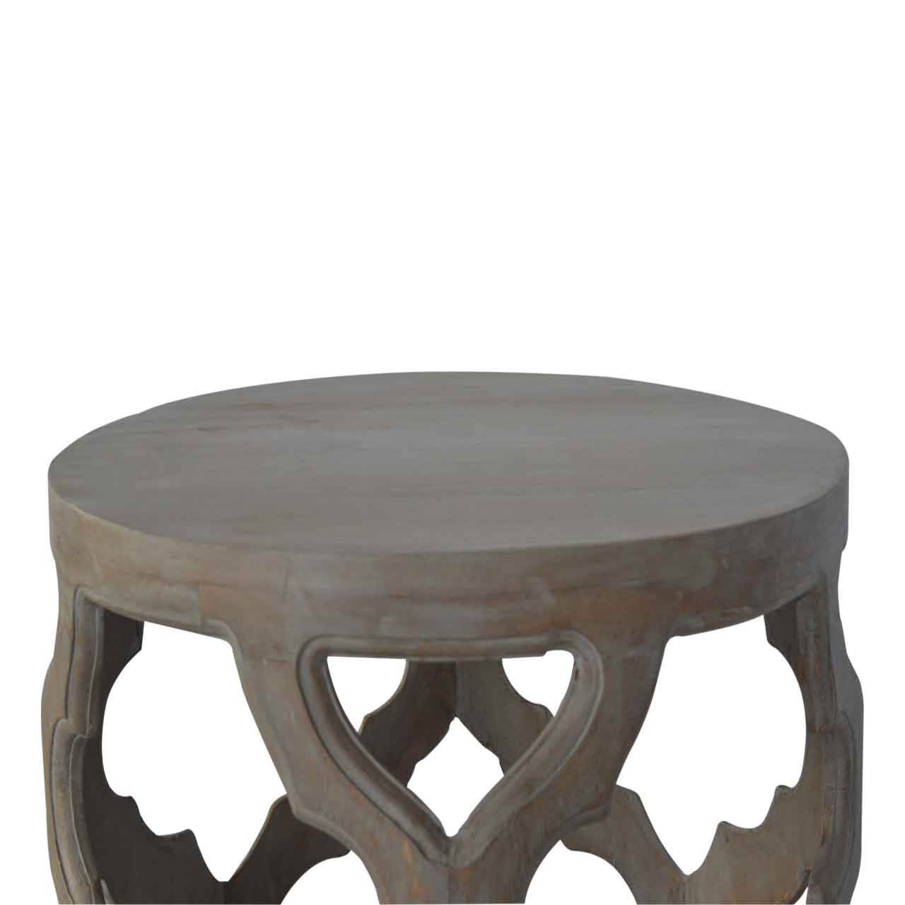 This stool is constructed from 100% solid mango wood and has a smooth grey wash finish. It is beautifully handcarved from skilled artisans, with a carefully carved floral base. A lovely addition to your home.