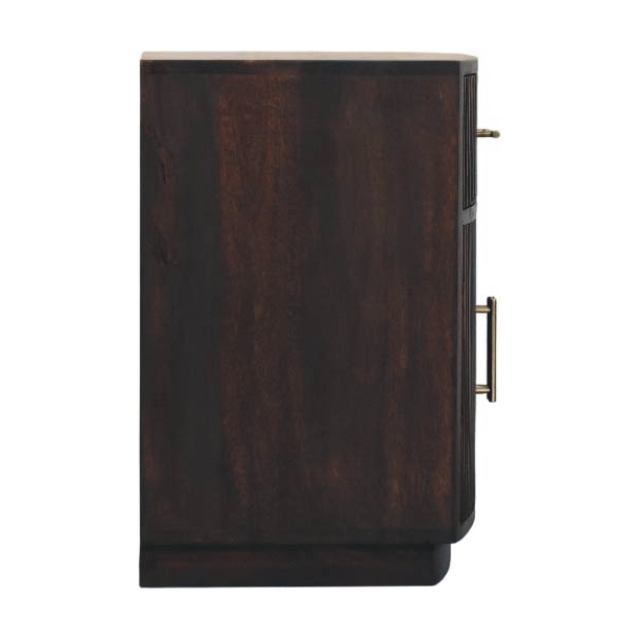 Elevate your bedroom with the Milan Bedside, a refined blend of texture and tone. Crafted from 100% solid mango wood and finished in a deep, luxurious Velvet Mocha, this piece brings understated sophistication to your space. The fluted design offers tactile appeal, while the brushed brass handles lend a touch of modern glamour. Featuring a single drawer and two cabinet doors, it offers practical storage without compromising on style. The Milan Bedside is perfect for interiors that favor rich finishes and timeless craftsmanship.