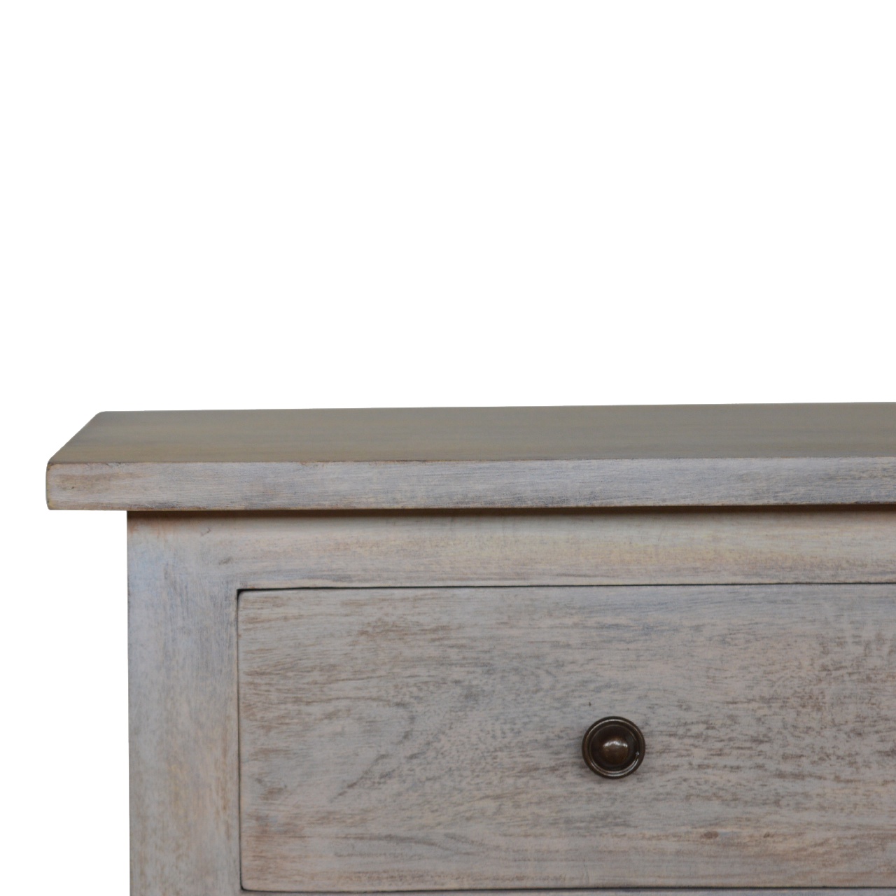 The bedside table provides compact, storage space for the bedroom. Its sturdy shape and smooth surface top is complimented by a lovely acid wash finish. It has been constructed from 100% solid mango wood featuring tapered feet and shiny brass knobs for easy access into the drawer and cabinet.