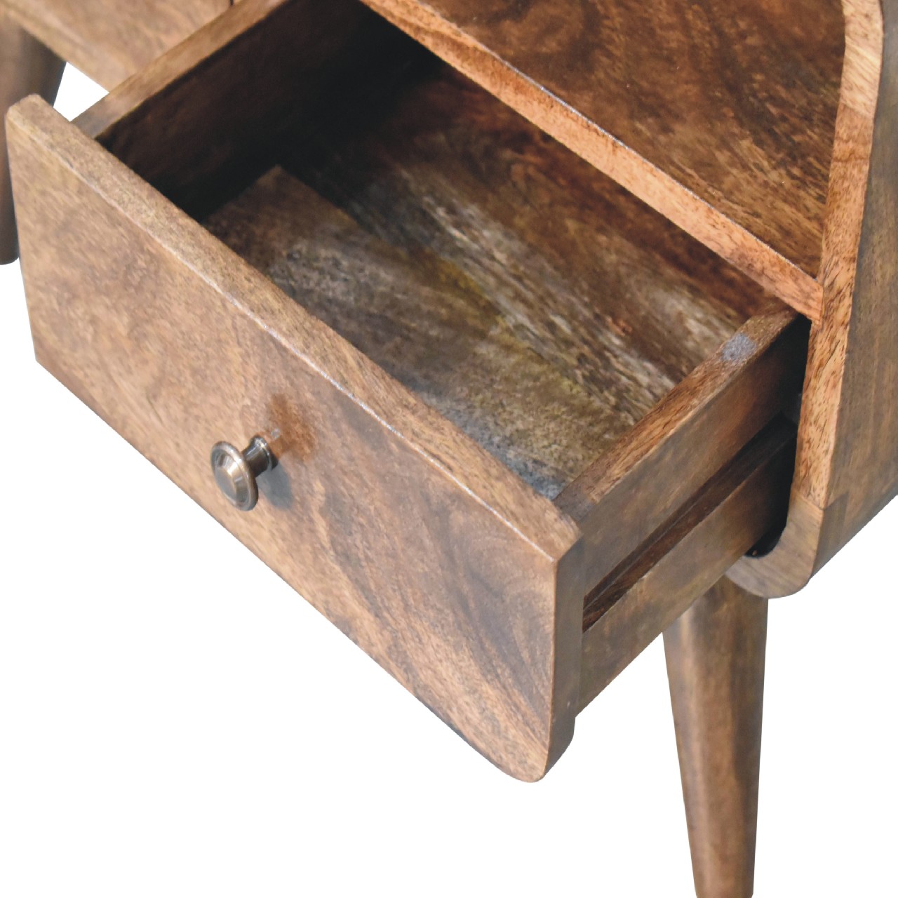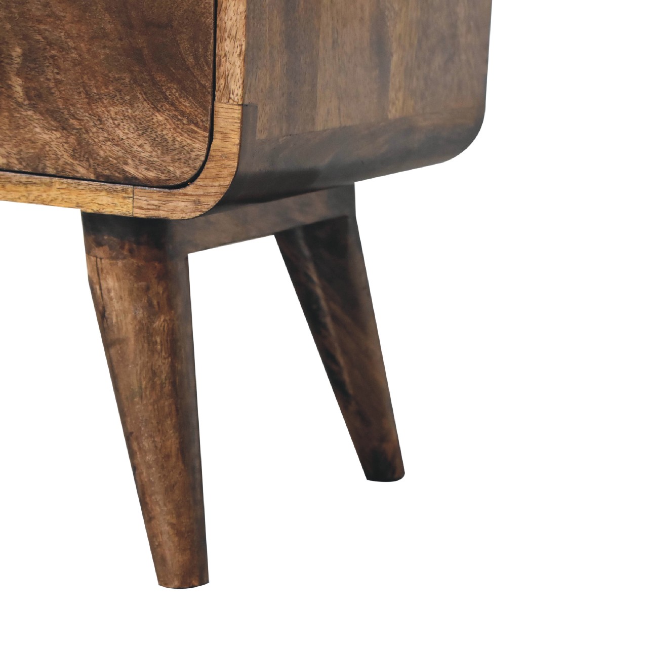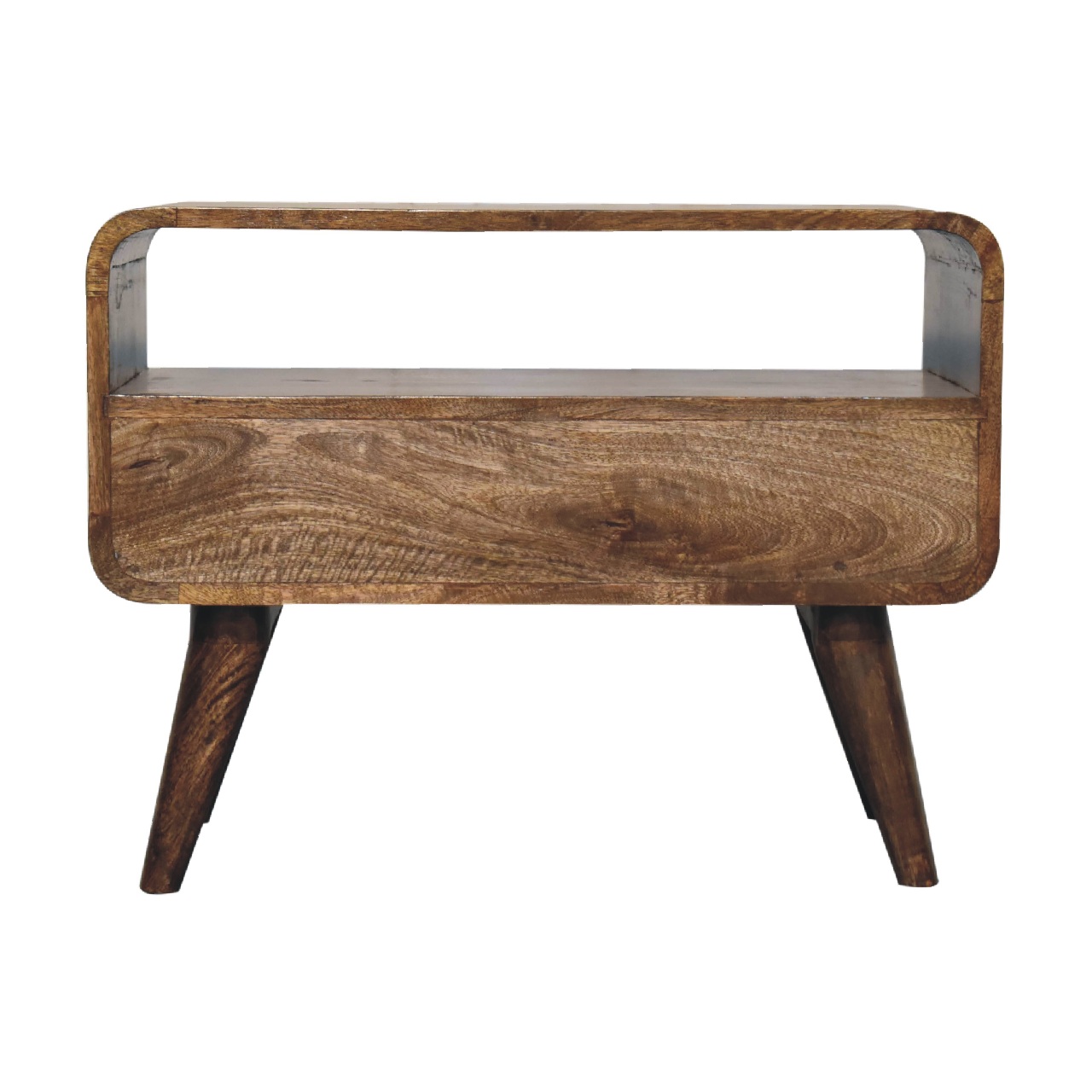 Our mini solid timber media unit is expertly constructed from 100% solid mango wood in a lovely grey-washed finish. Some features include 2 drawers that come with a shiny knob, a large open slot to place any books, photo frames, ornaments, and 4 Nordic-style legs. This petite product is a part of Recession Collection.