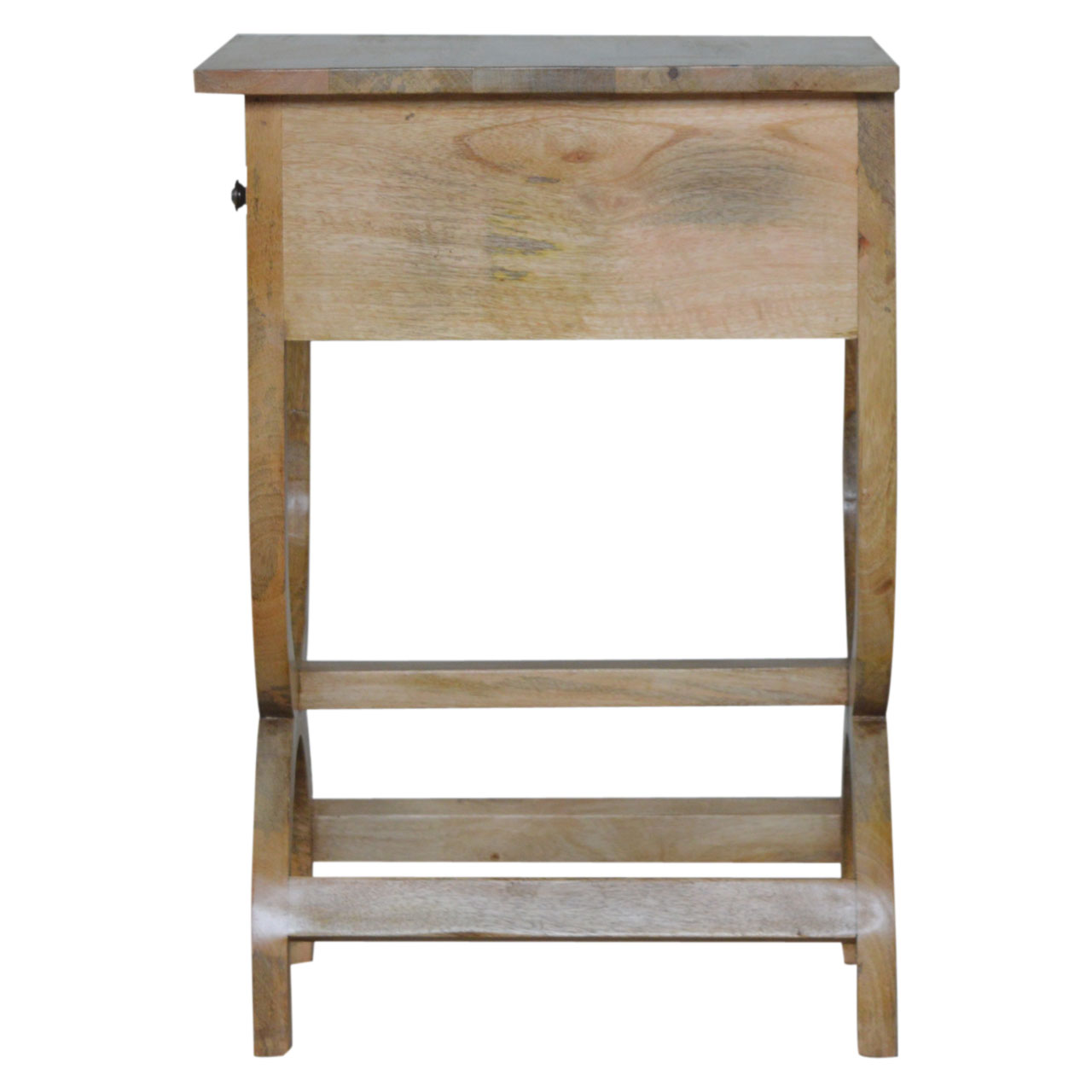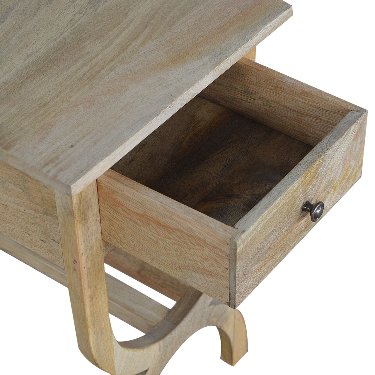 This bedside or end table has been constructed from 100% solid mango wood in an oak finish finish. Some features of this include classic serpentine feet with a strong undercarriage support which give extra character to the piece. It has one handy drawer which has a shiny knob and is the perfect addition to any bedroom and home.