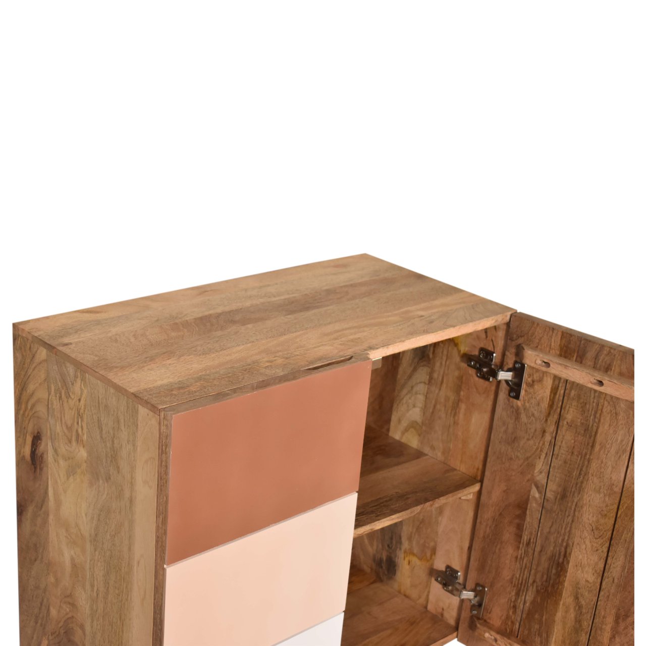 Offering a clean and sharp L pattern and hand painted in 3 rich shades of brown this cabinet offers plenty of room on top for a candle, ornament or plant. Storage is offered with two doors which can be used to easily store bits and pieces with the space of 2 drawers. Other features include Nordic style legs and the body is constructed from 100% solid mango wood.