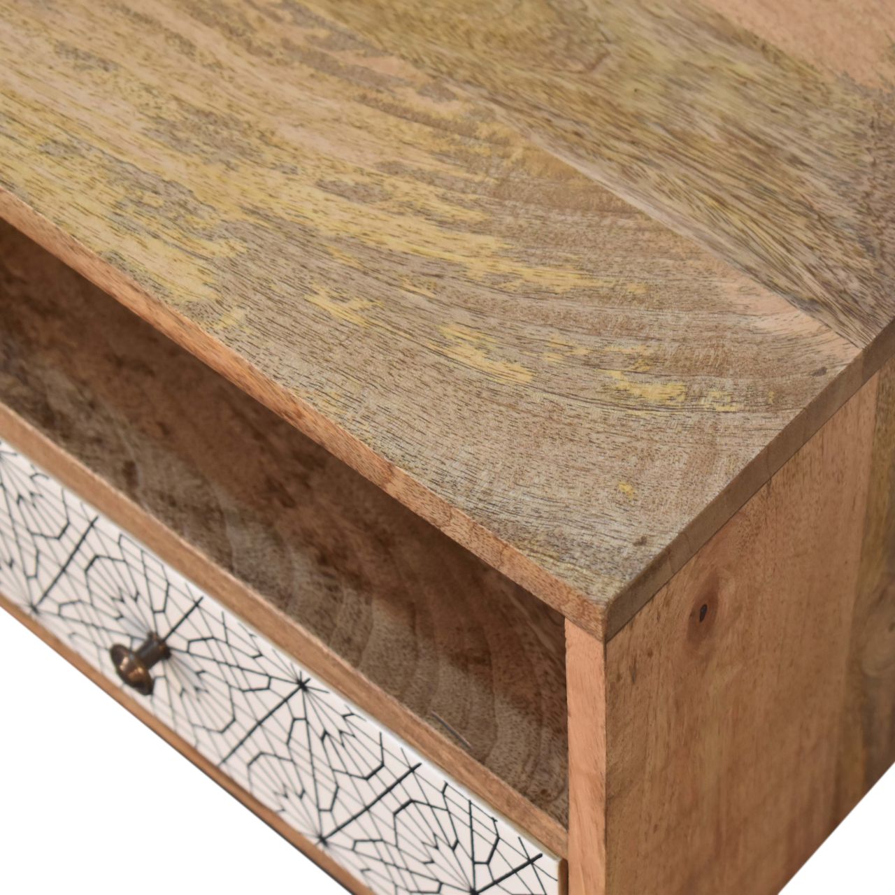 This 2 drawer media unit has been constructed from 100% solid mango wood and finished in a fine oak finish finish body. The main feature of this piece are the screen printed drawer fronts and which each have a beautiful black and white geometric design giving the piece extra dimension and character. Useful storage is provided with the open slots and drawers that can be used to store any CD’s, films or books.