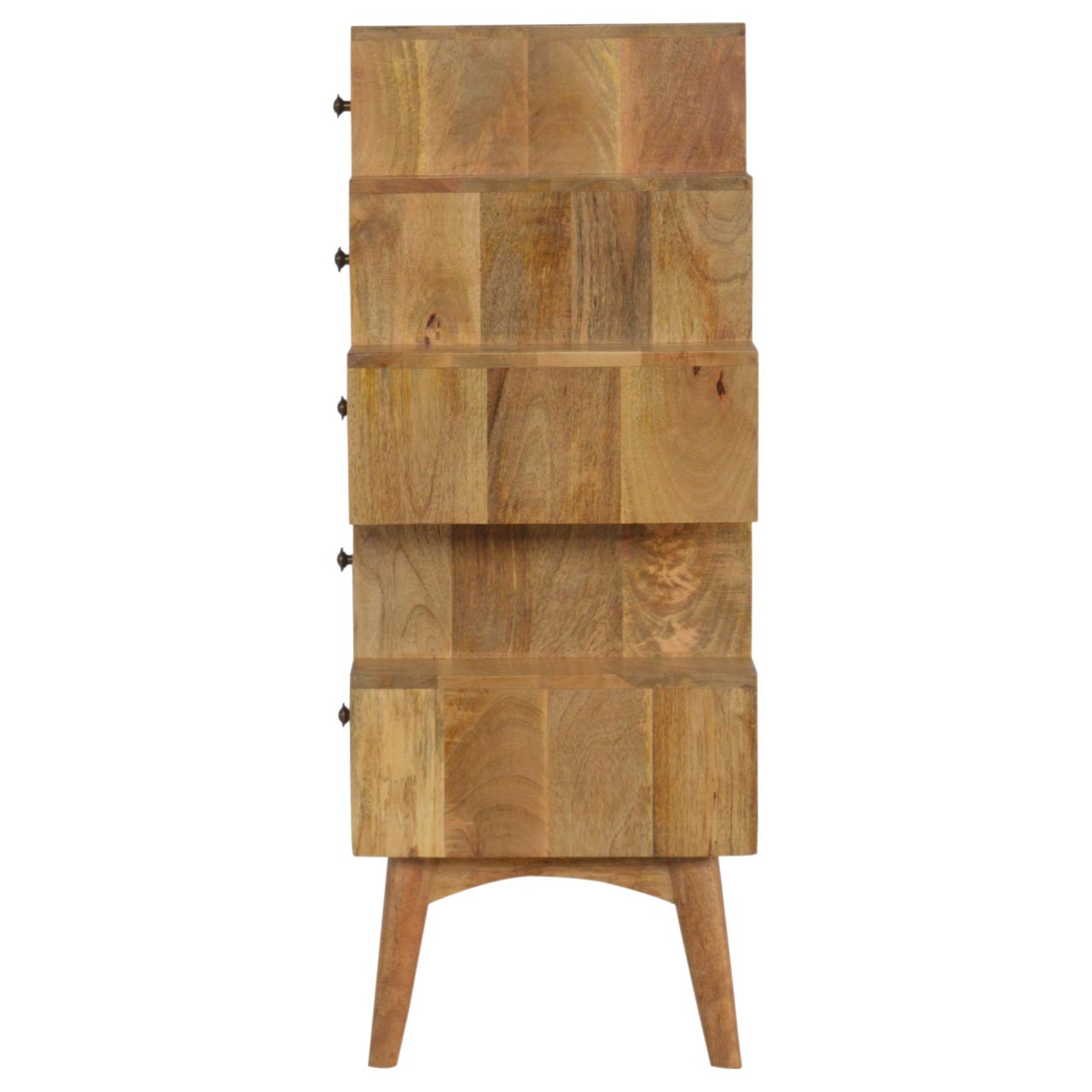 This Scandinavian styled 5 drawer chest is constructed from 100% solid mango wood and has a fine oak finish finish. The five drawers in this chest are all different sizes resting on top of each other, adding a very unique beautiful style to your home. Other features include Scandinavian styled feet and round shiny knob handles which have a pewter finish.