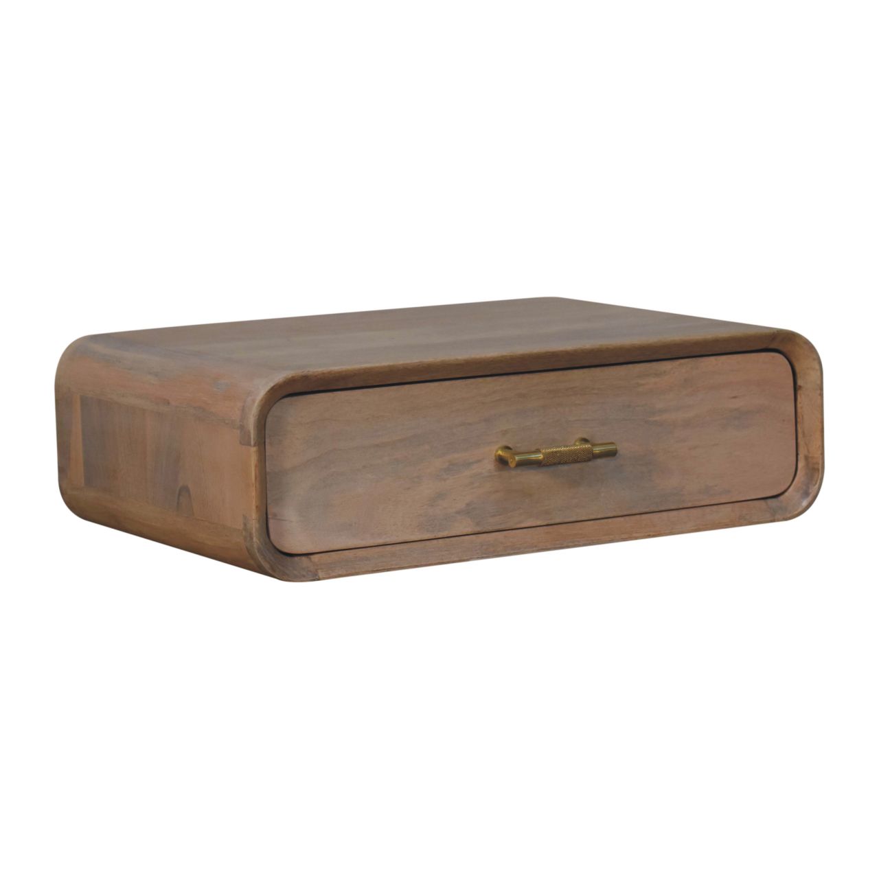 This wall-mounted unit is crafted from 100% solid mango wood with an oak finish finish, offering both durability and beauty. It features a spacious drawer adorned with a stylish T-bar handle, adding a touch of sophistication to its design. Perfect as a bedside table or compact storage solution in any room, this versatile piece combines functionality with modern elegance, saving floor space while providing easy access to essentials.