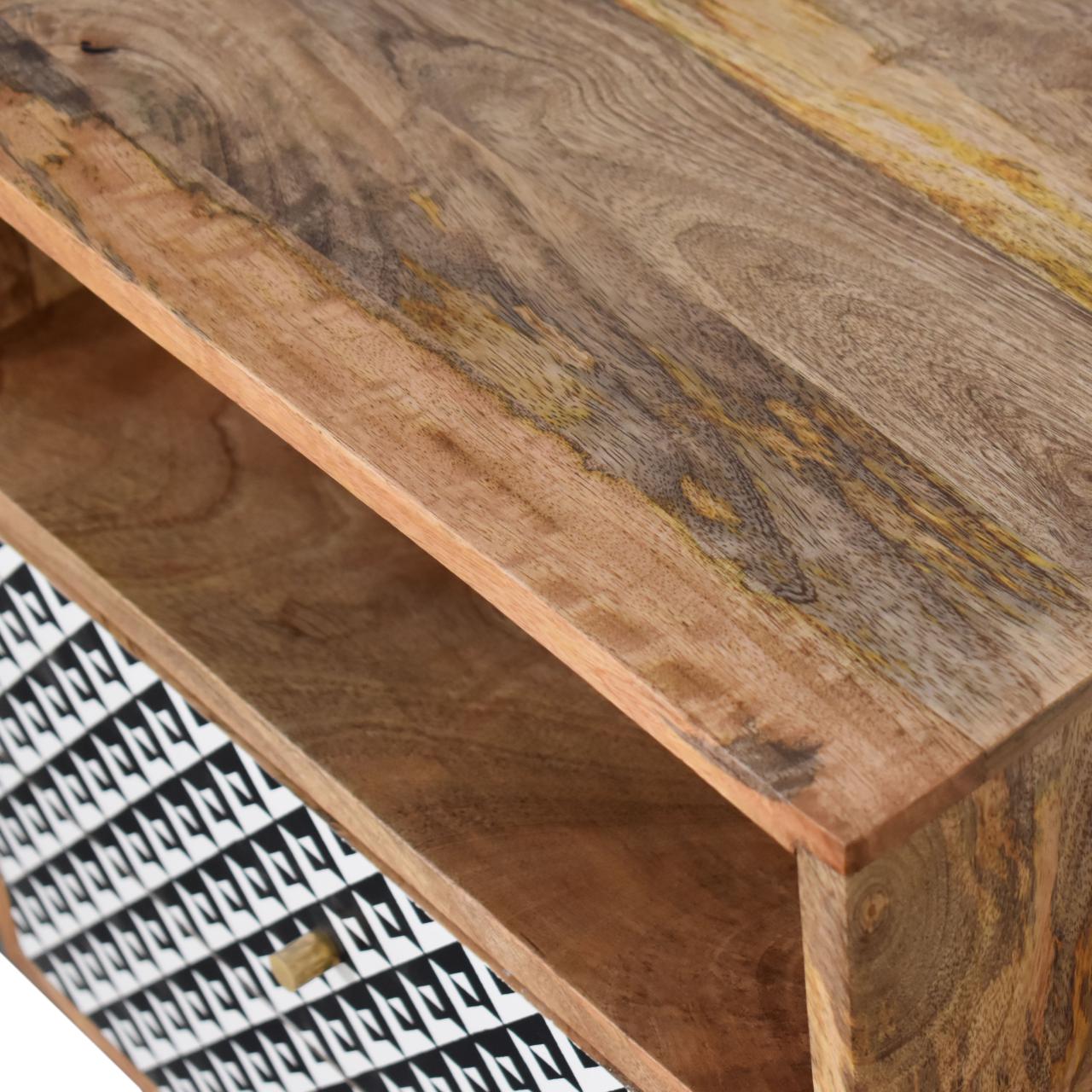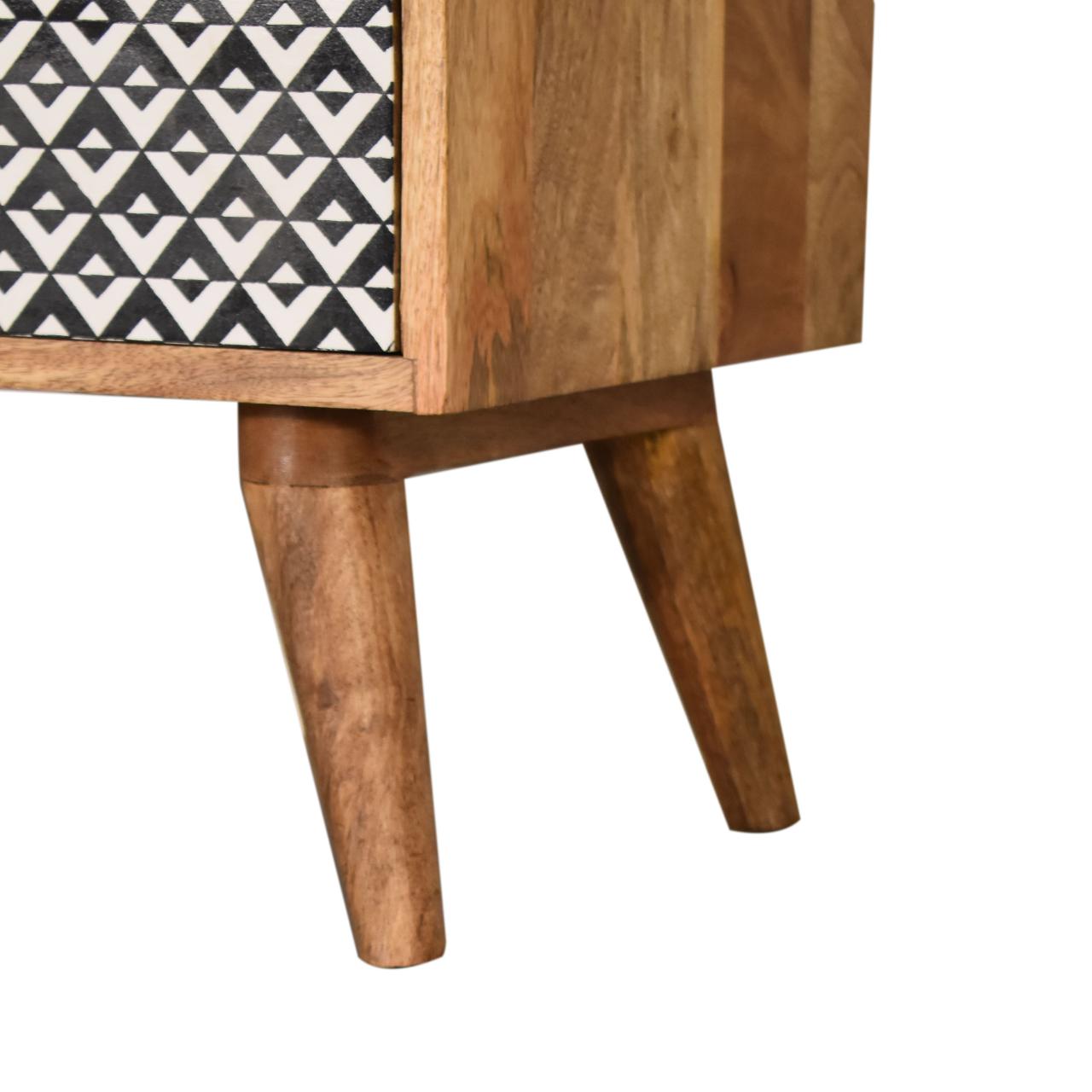 This bedside has been constructed from 100% solid mango wood and finished in a fine oak finish finish body. The 2 drawers feature a black and white pattern which is bound to uplit your bedroom and allow you to store any bits and pieces discreetly. It also has 4 Nordic style legs and ample space on top for a lamp, photo frames or ornaments.
