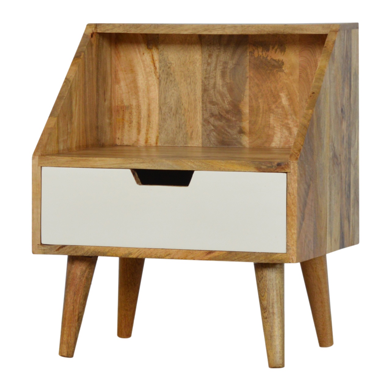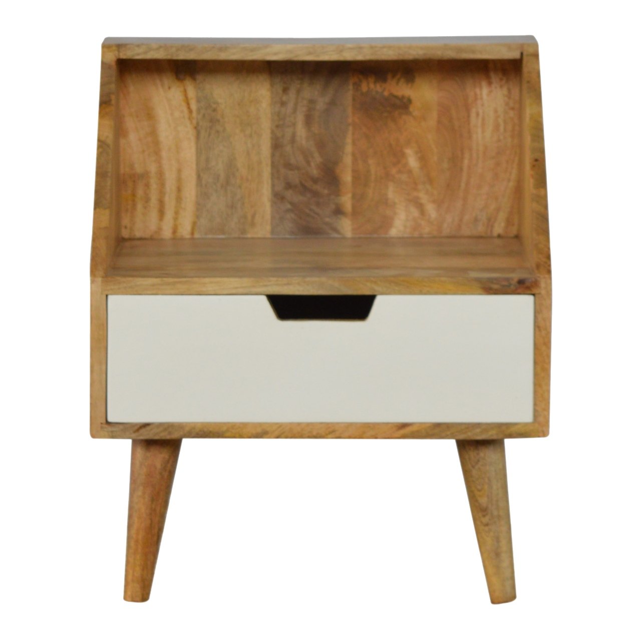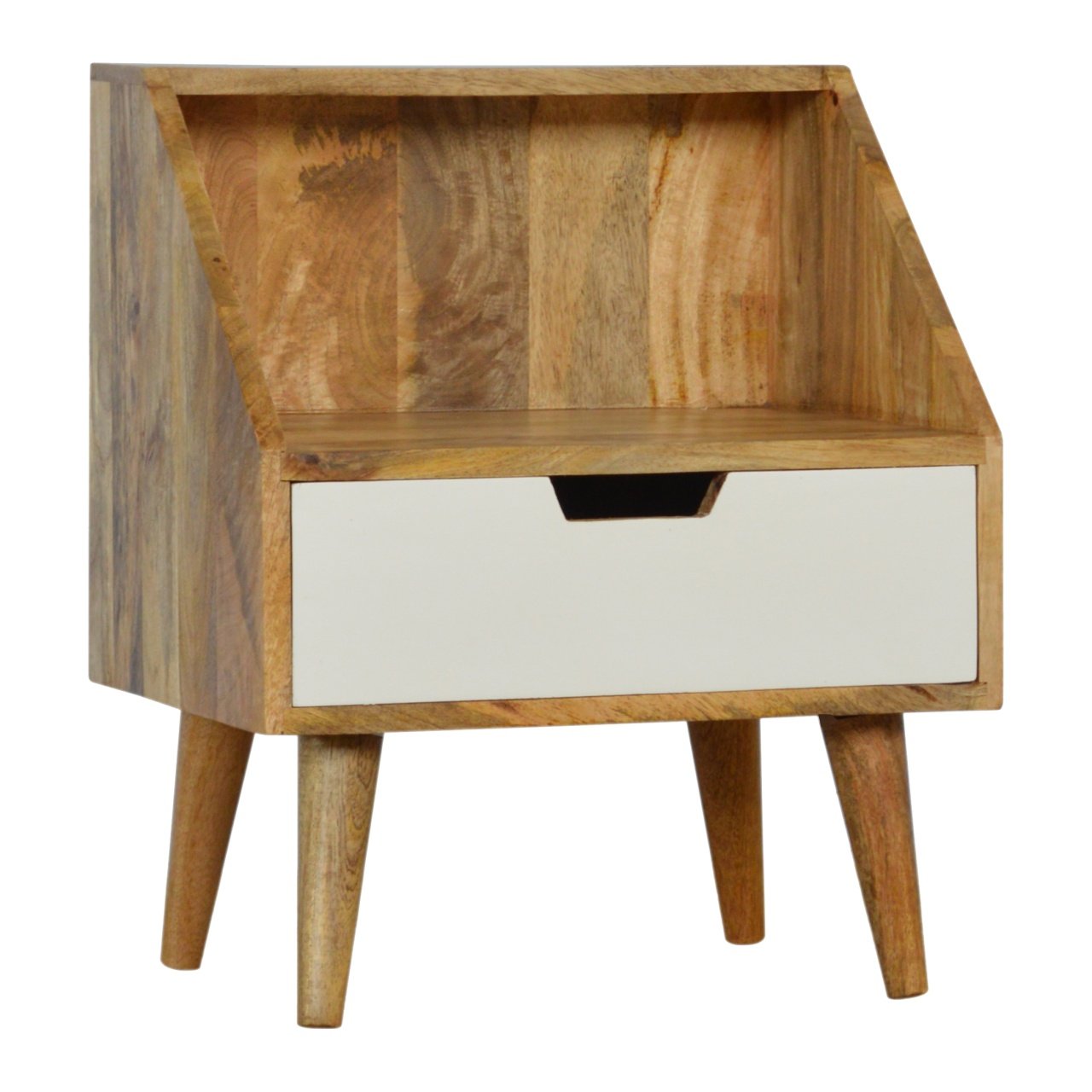 This bedside table is the perfect stand for any bits and pieces you wish to keep nearby before bedtime. It features a raised open slot providing ample space for a lamp, photo frame or any ornaments. It has been constructed from 100% solid mango wood with a fine oak finish finish body and 1 white hand painted drawer. Some other product characteristics are 4 Nordic style legs with cut out slots for easy access to and from the drawers.