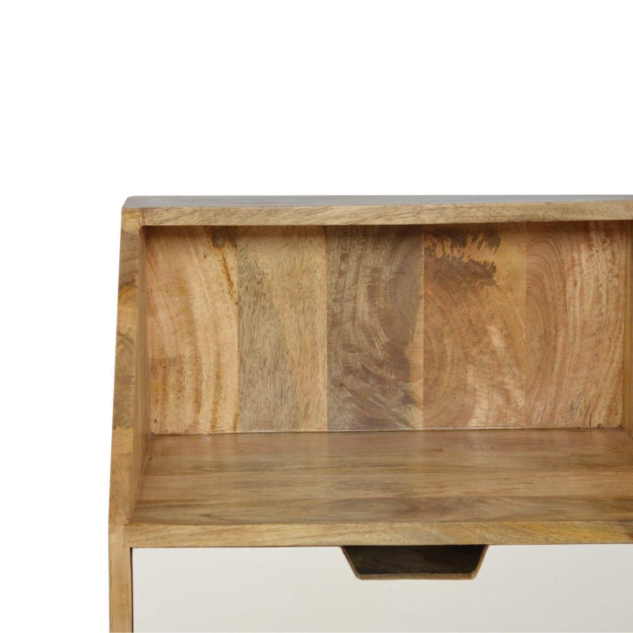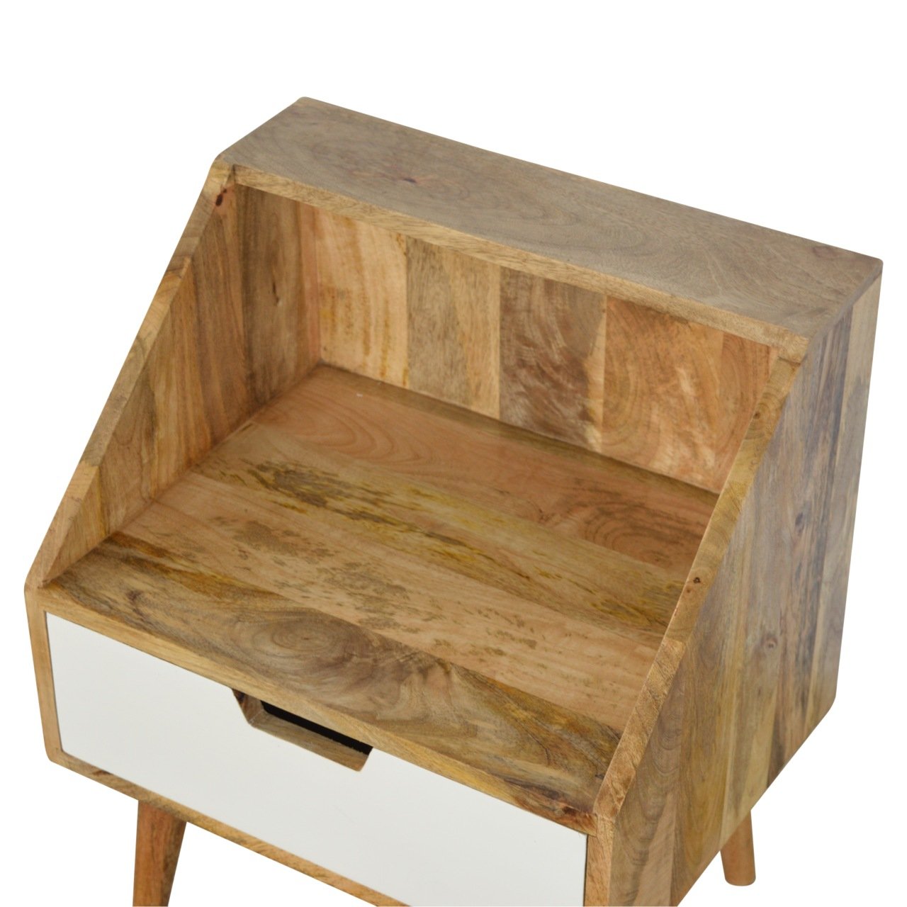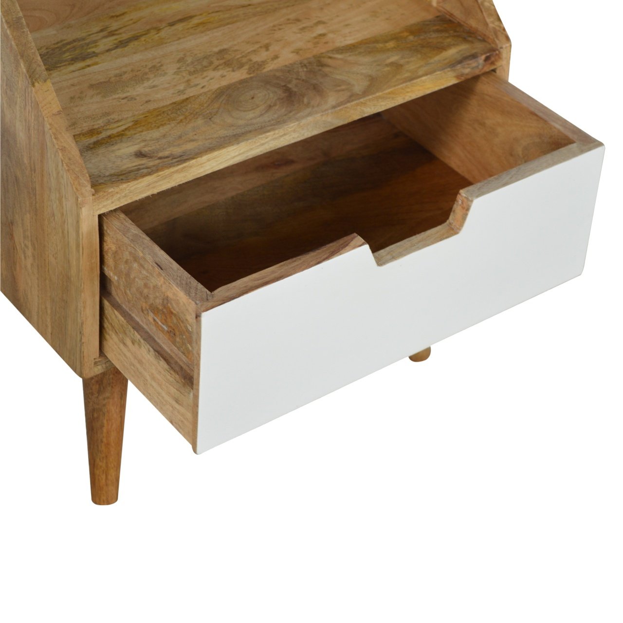 This bedside table is the perfect stand for any bits and pieces you wish to keep nearby before bedtime. It features a raised open slot providing ample space for a lamp, photo frame or any ornaments. It has been constructed from 100% solid mango wood with a fine oak finish finish body and 1 white hand painted drawer. Some other product characteristics are 4 Nordic style legs with cut out slots for easy access to and from the drawers.