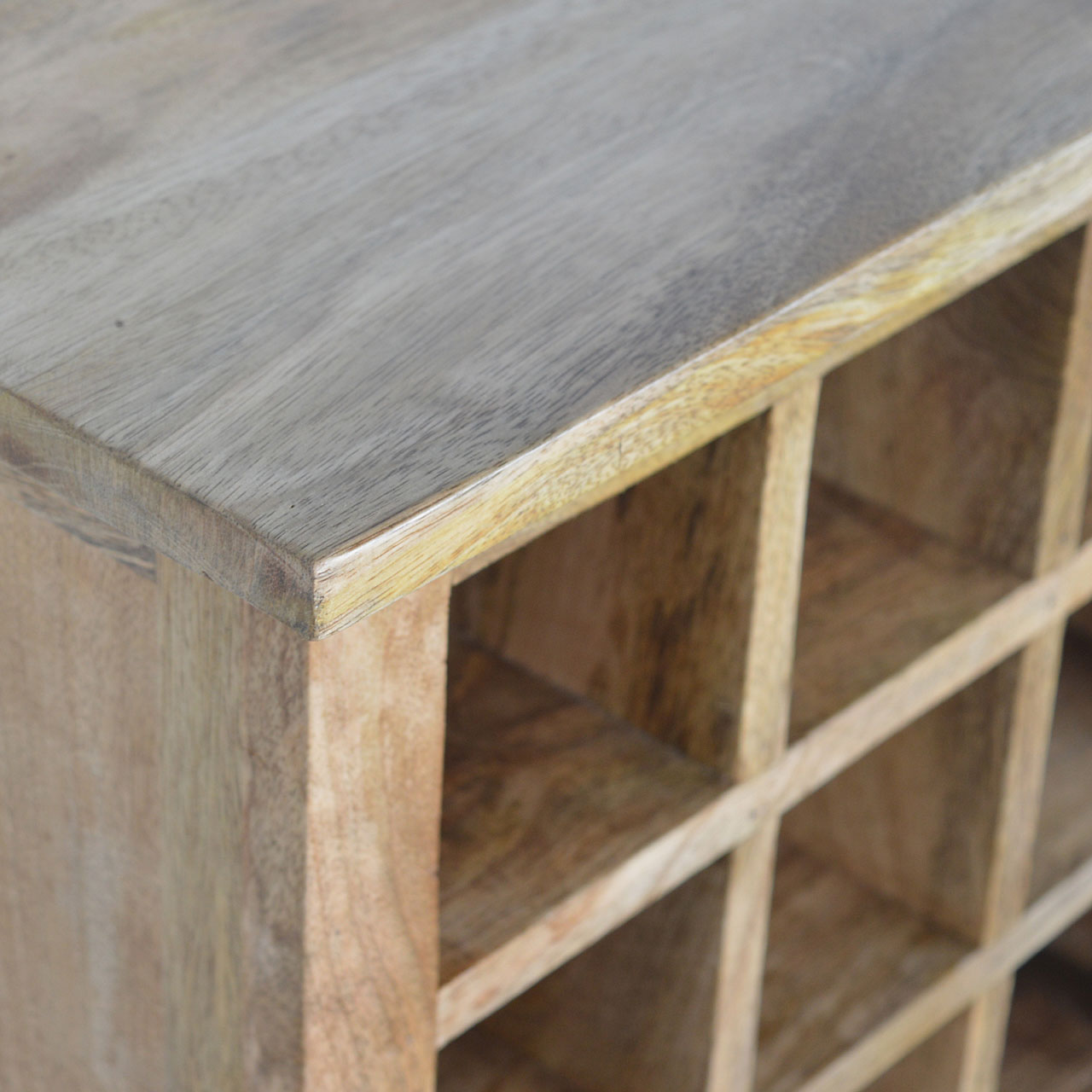 This is a beautifully handcrafted cabinet that offers 3 drawers and 9 wine bottle slots, it is constructed from 100% solid mango wood with an oak finish finish. The slots are ideal to store any wine bottles and groceries or bits and bobs for the kitchen on the lower three shelves. It is practical storage that is built to last and is the perfect addition to any kitchen or dining room. Every piece of furniture is individually handcrafted and includes swing care tickets explaining the cautions and aftercare instructions.
