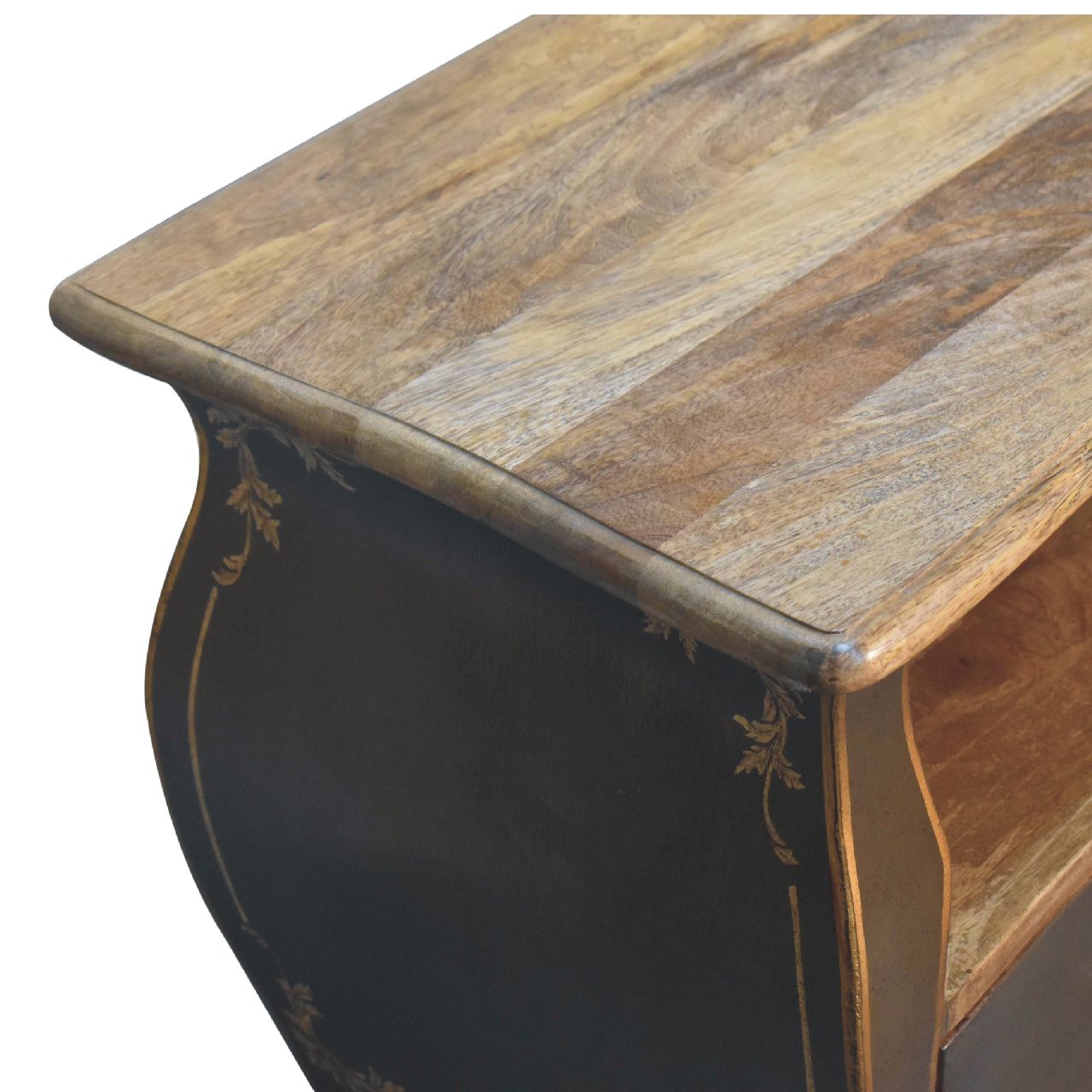 Discover elegance with the Coroner Collection Medis Unit, a French-style masterpiece in a unique greyish-green finish with a natural top and inside the drawers. Made from solid mango wood, this bedside table features a hand-painted, sketched crown crest design, adding a royal touch to your bedroom. The design is complemented by sophisticated Chantilly legs and shiny brass knobs, blending functionality with luxury. Ideal for those who cherish a blend of elegance, durability, and historical charm in their home decor, this piece is destined to become a family heirloom.