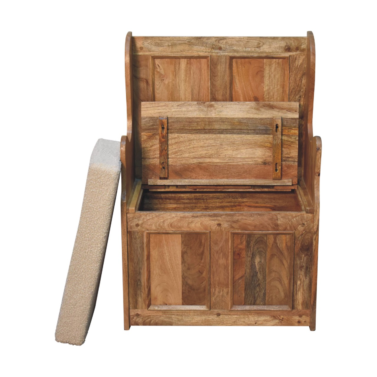 Our Small Monks Storage Bench is a practical and stylish solution for smaller hallways. Handmade from solid mango wood in an oak finish finish, it features exquisite carved sides and intricate panel detailing. With ample storage space inside, this country-style bench provides convenience without taking up too much space. The cream boucle seat adds a touch of elegance to complete the look.