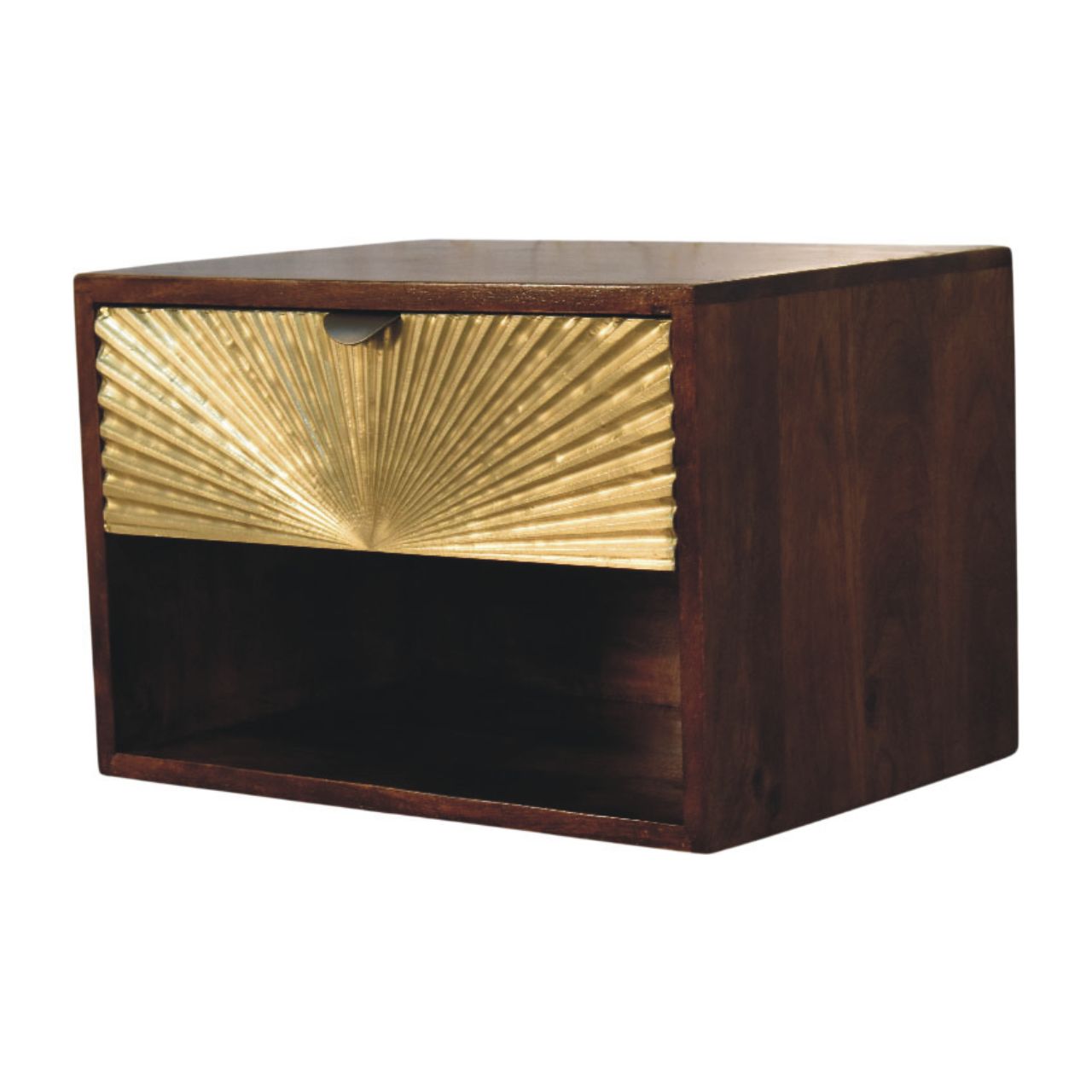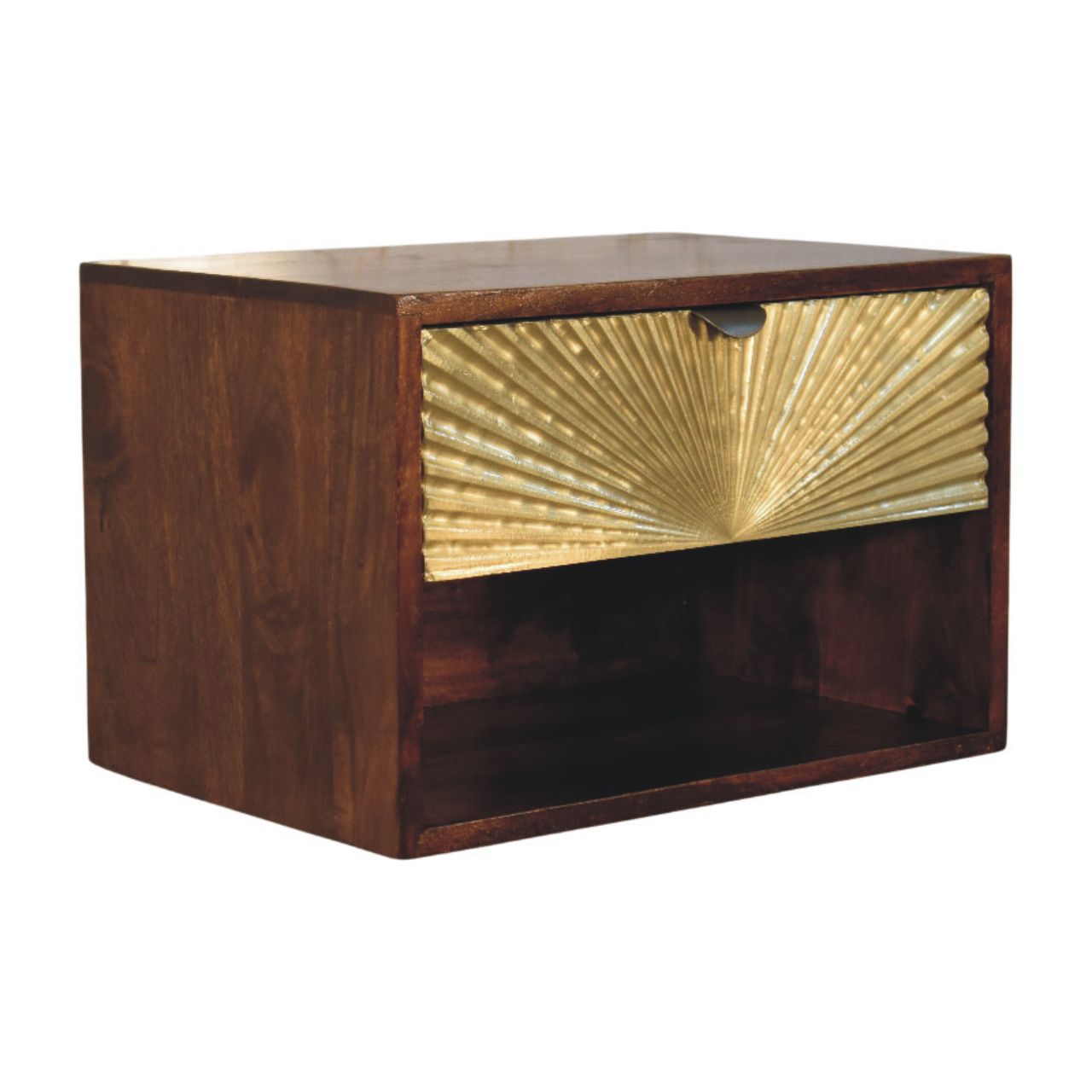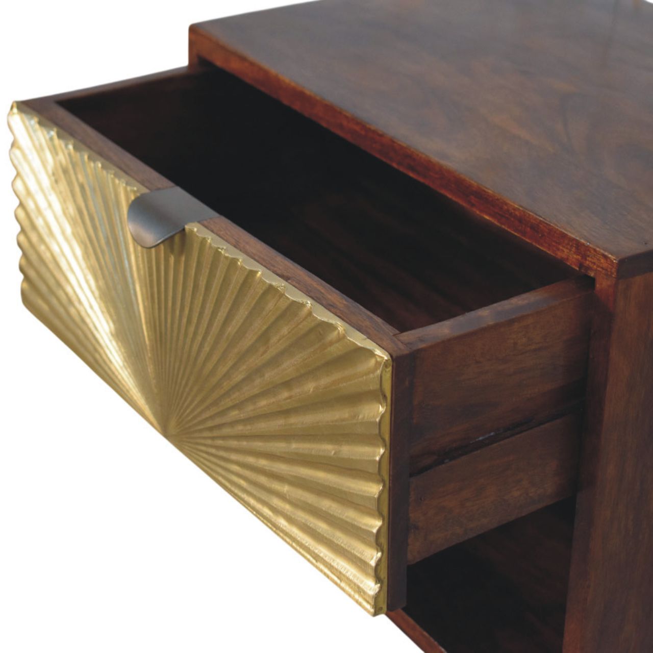 A striking blend of artistry and function, the Sunburst Wall-Mounted Bedside is handcrafted from 100% solid mango wood and finished in a rich Chestnut tone that brings warmth and depth to the bedroom. The statement drawer front features a sculptural brass sunburst panel, catching the light with subtle texture while adding a refined, decorative edge. Designed to float cleanly against the wall, it frees up floor space and creates a calm, uncluttered look, with an open lower shelf for everyday essentials and a smooth-glide drawer for discreet storage. Elegant yet practical, this piece brings boutique-hotel sophistication to modern and classic interiors alike.