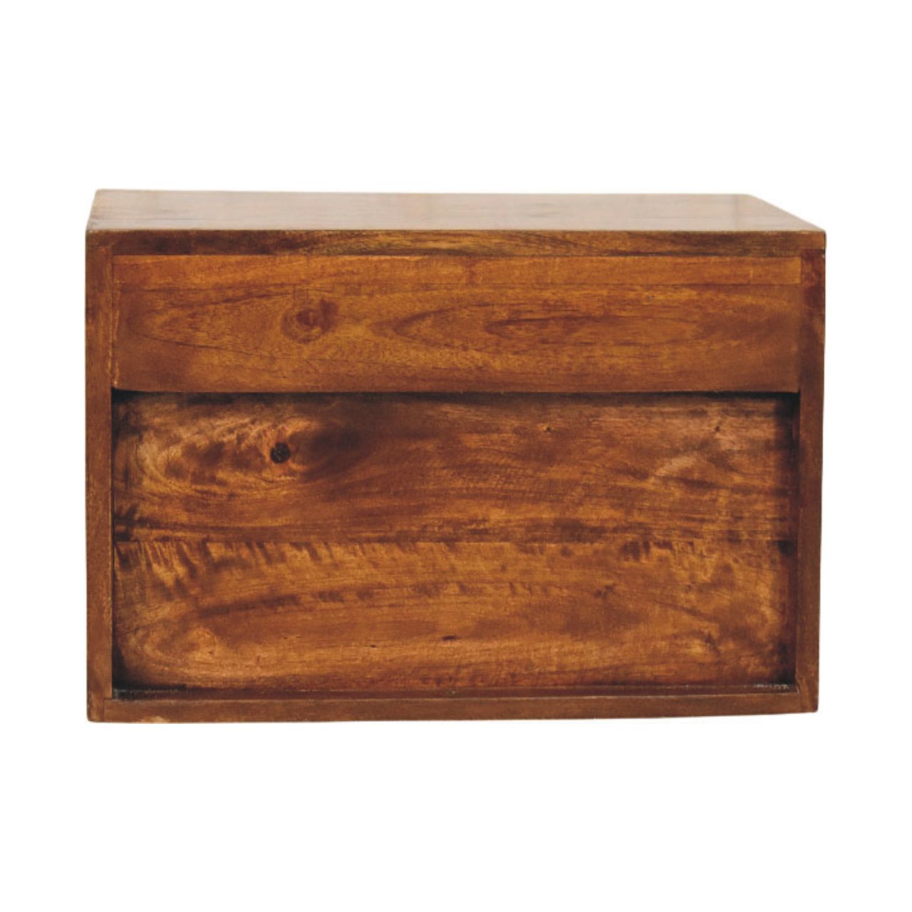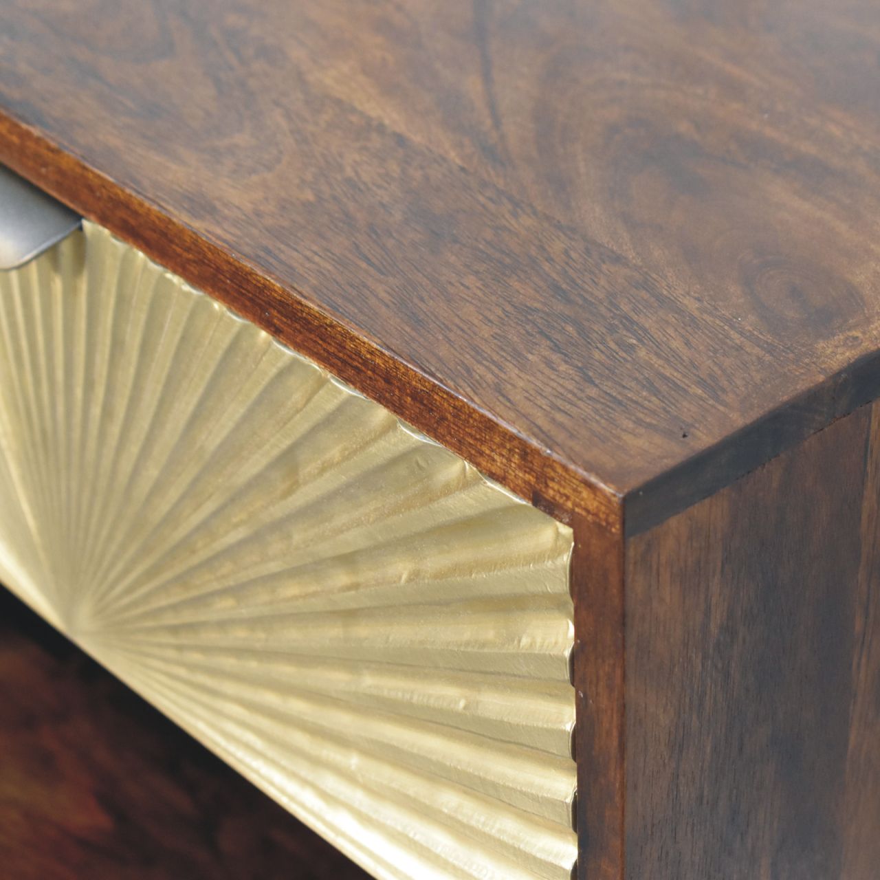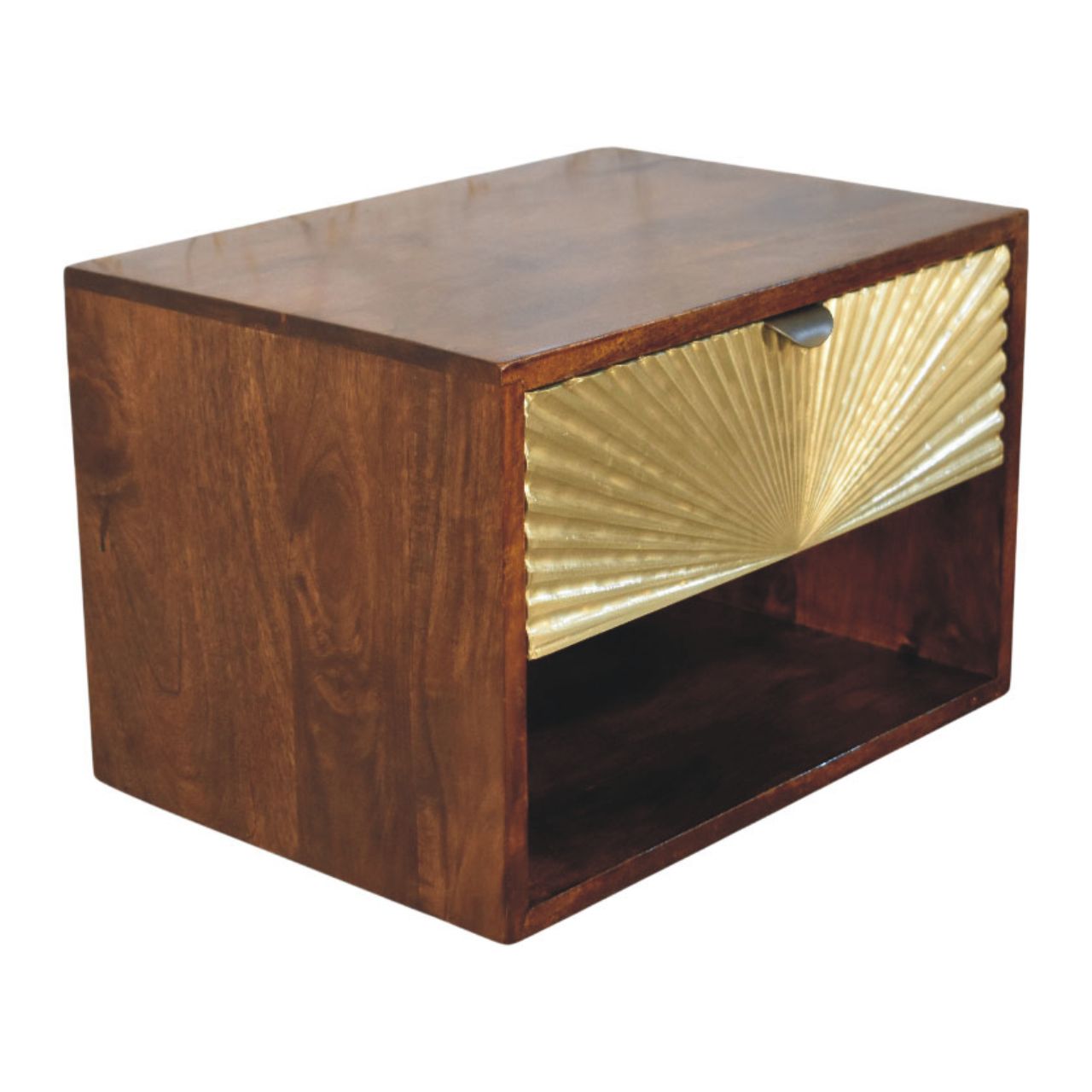 A striking blend of artistry and function, the Sunburst Wall-Mounted Bedside is handcrafted from 100% solid mango wood and finished in a rich Chestnut tone that brings warmth and depth to the bedroom. The statement drawer front features a sculptural brass sunburst panel, catching the light with subtle texture while adding a refined, decorative edge. Designed to float cleanly against the wall, it frees up floor space and creates a calm, uncluttered look, with an open lower shelf for everyday essentials and a smooth-glide drawer for discreet storage. Elegant yet practical, this piece brings boutique-hotel sophistication to modern and classic interiors alike.