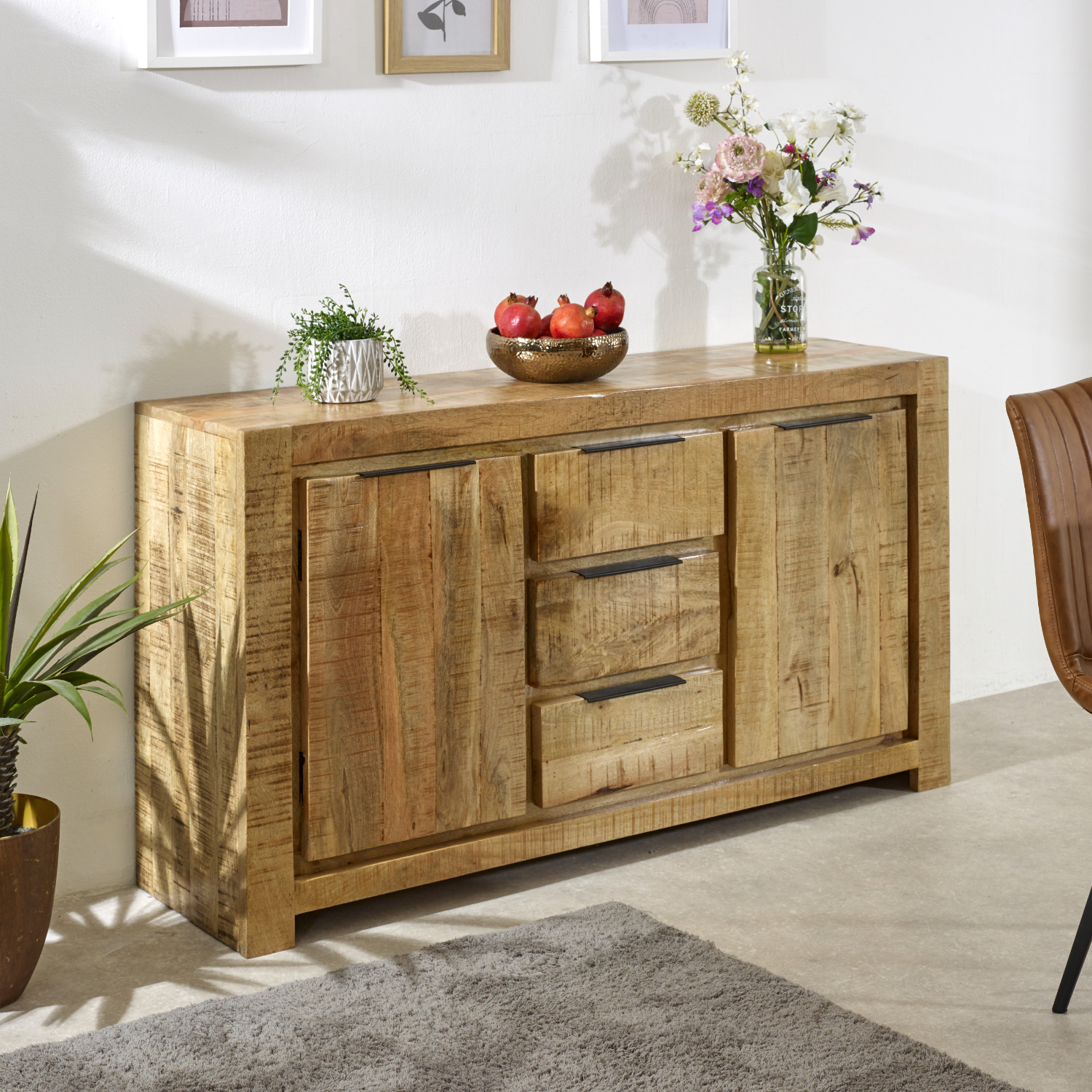 This magnificent large sideboard features 2 cupboards and 3 drawers which will provide the answer to all your storage needs. Perfect for any room in the house that you need to store items not wanted on display. Plates, cutlery etc in dining room, clothes in bedroom, or Books, games, IT equipment in the lounge – the possibilities are endless. The rough sawn laquered finish wood and metal handles are both rustic and modern, highlighting the natural beauty of the wood with a handmade unique look and feel. Made entirely using 100% eco sourced solid natural wood by skilled craftsmen in India.