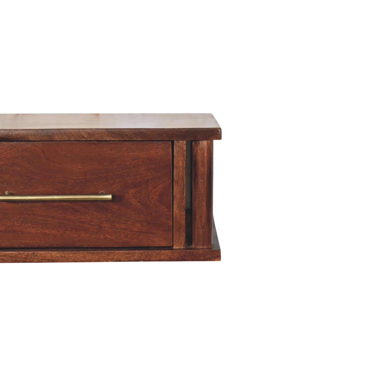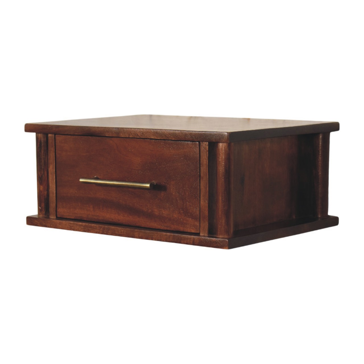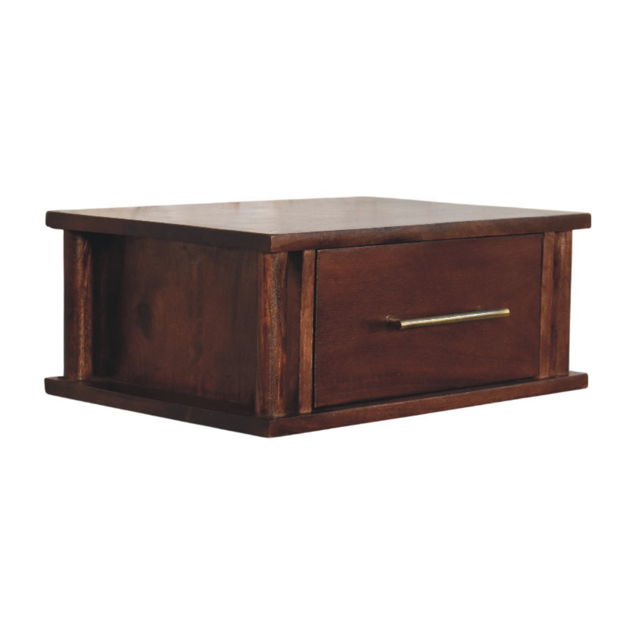Designed to bring quiet sophistication to the bedroom, this wall-mounted bedside is handcrafted from 100% solid mango wood and finished in a rich Wine Wood Oak tone that highlights the natural grain and warmth of the timber. Its clean, floating form creates a sense of lightness while offering practical bedside storage within a single smooth-gliding drawer, accented by a slim brass handle for a refined contrast. Ideal for compact spaces or contemporary interiors, this piece keeps essentials close at hand while maintaining a calm, uncluttered aesthetic, blending timeless craftsmanship with modern functionality.