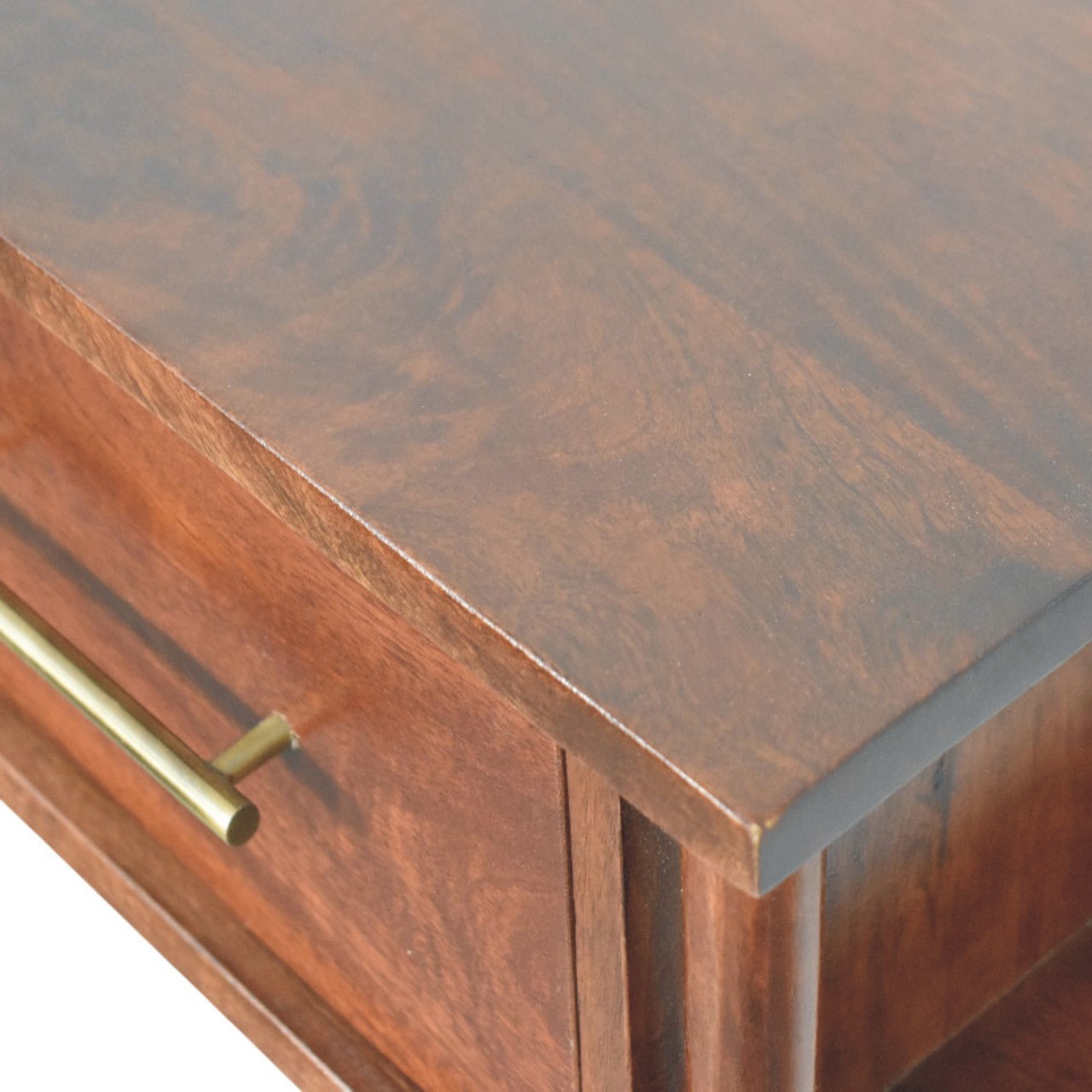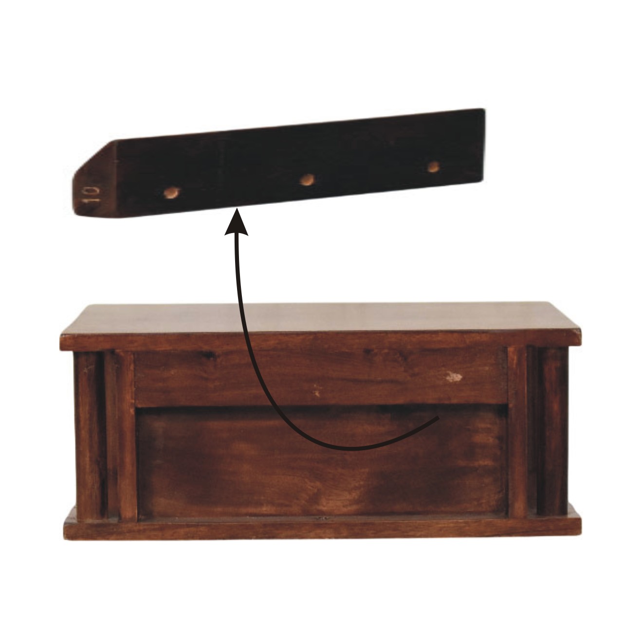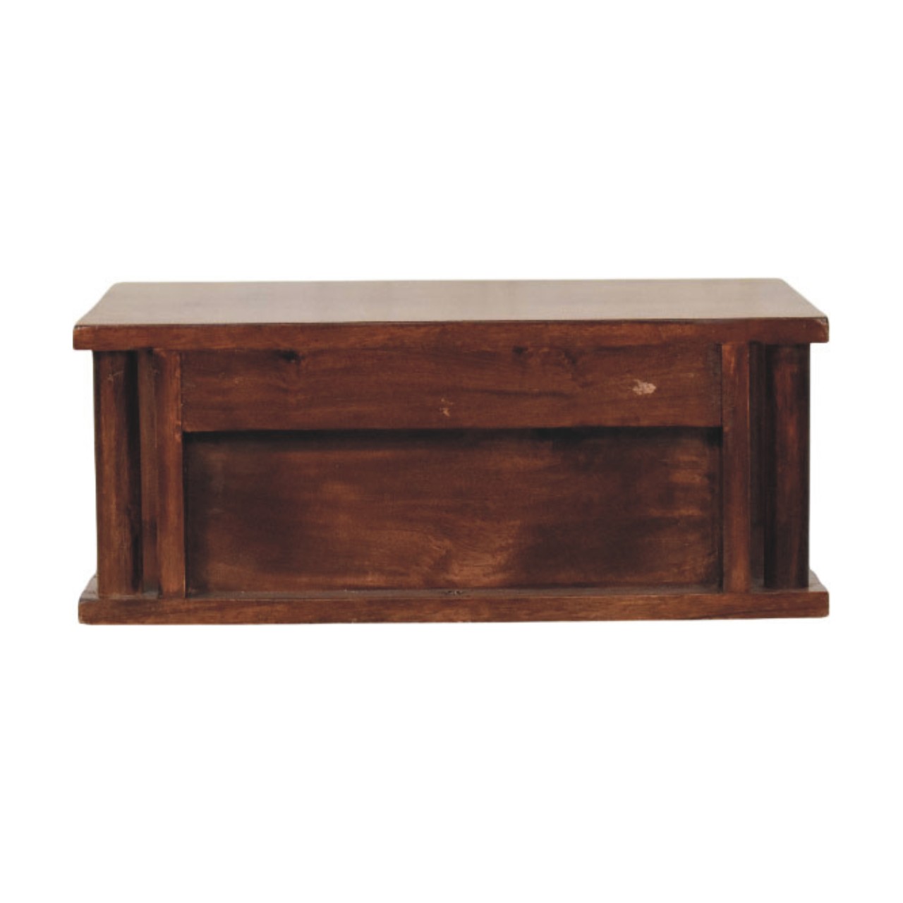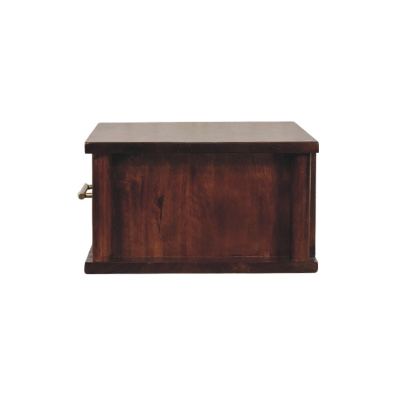 Designed to bring quiet sophistication to the bedroom, this wall-mounted bedside is handcrafted from 100% solid mango wood and finished in a rich Wine Wood Oak tone that highlights the natural grain and warmth of the timber. Its clean, floating form creates a sense of lightness while offering practical bedside storage within a single smooth-gliding drawer, accented by a slim brass handle for a refined contrast. Ideal for compact spaces or contemporary interiors, this piece keeps essentials close at hand while maintaining a calm, uncluttered aesthetic, blending timeless craftsmanship with modern functionality.